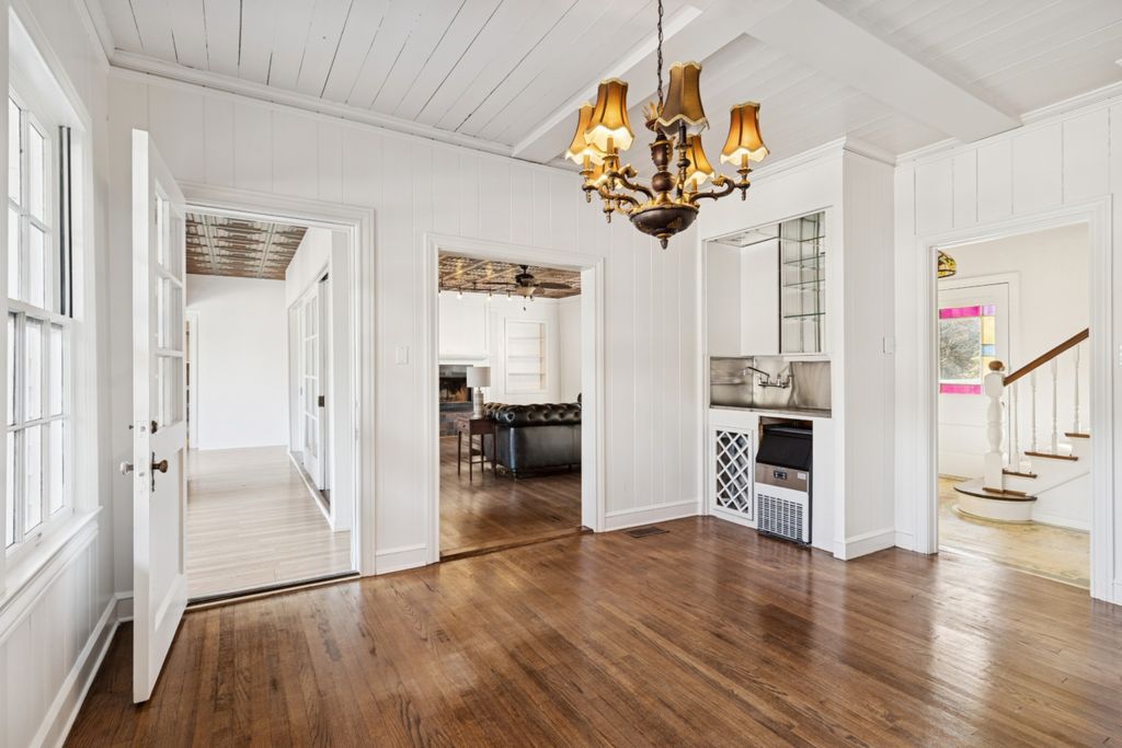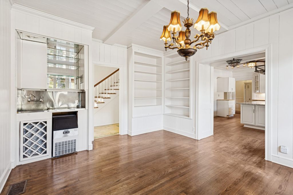 The central dining room acts as a natural gathering point within the home, linking multiple living spaces while maintaining its own identity. A traditional chandelier anchors the room, complemented by a built-in wet bar that enhances both everyday functionality and entertaining potential.