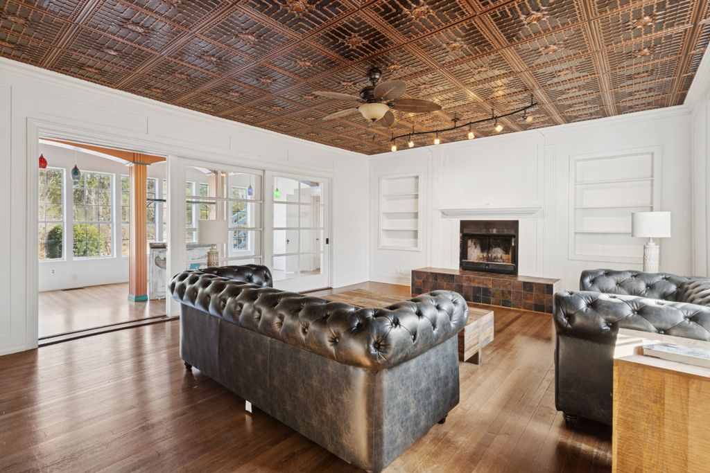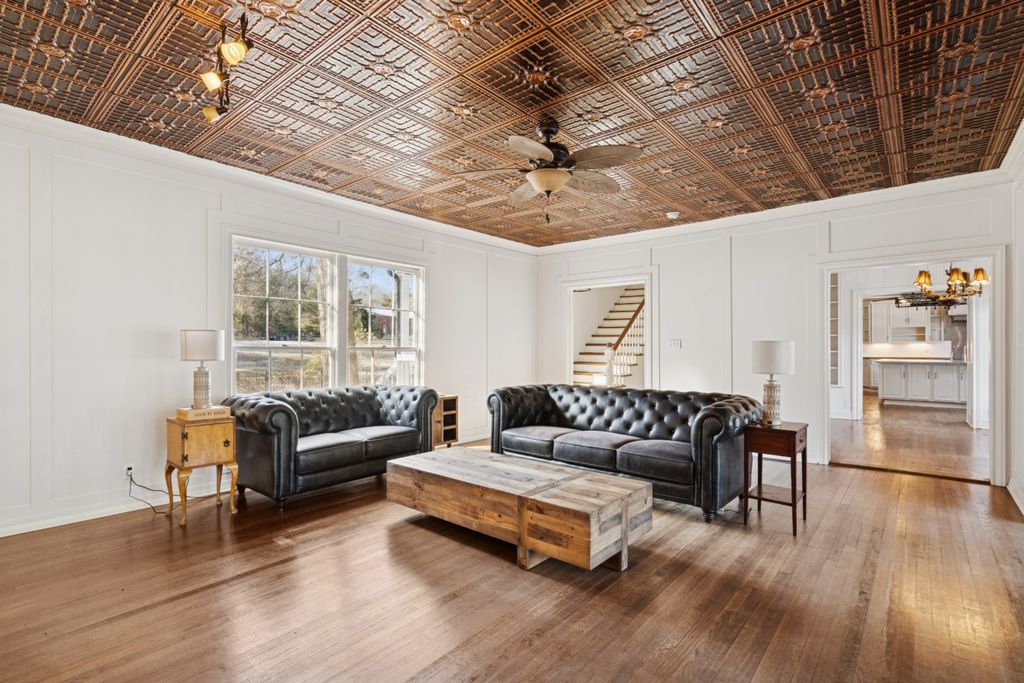 Stepping inside, the interiors reveal a space grounded in warmth and simplicity. Hardwood floors extend throughout the primary living areas, while white-paneled walls reflect natural light streaming in through large windows. A patterned tin ceiling crowns the main living room, adding texture and subtle visual interest without overpowering the home’s relaxed aesthetic.