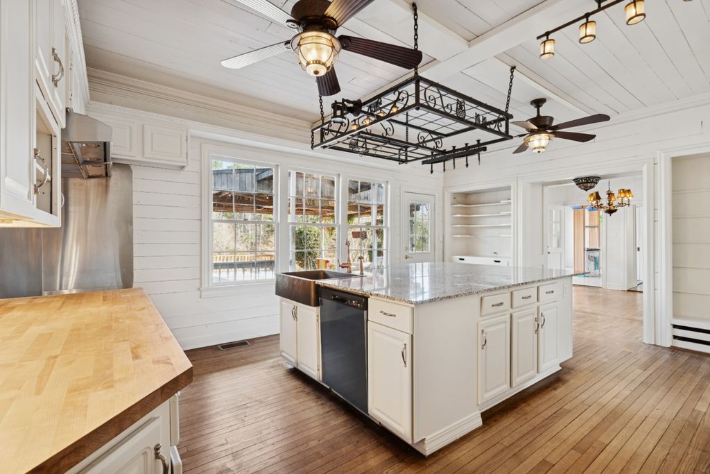 Nearby, the kitchen reflects a careful balance between traditional craftsmanship and practical design. White cabinetry lines the walls, while a large central island topped with stone countertops and a farmhouse sink creates a versatile workspace. Stainless steel appliances and butcher block surfaces introduce contrast, while overhead details such as a hanging pot rack and paneled ceiling reinforce the home’s utilitarian charm.