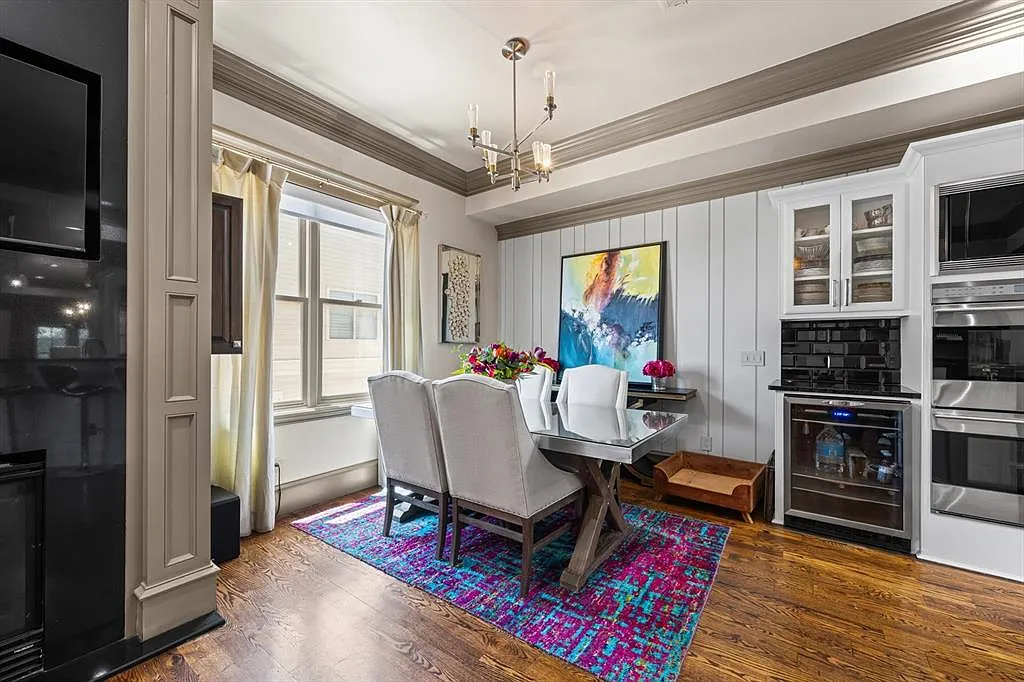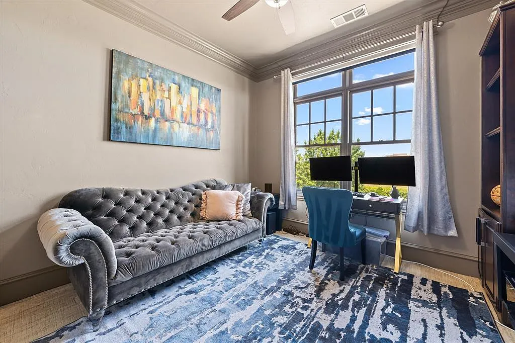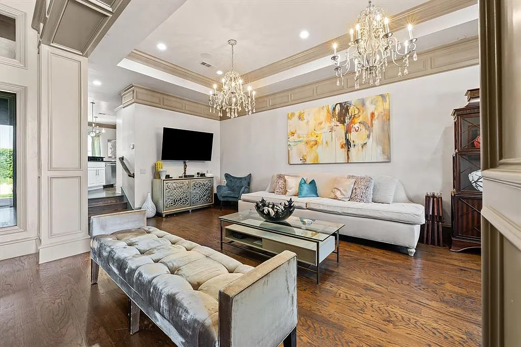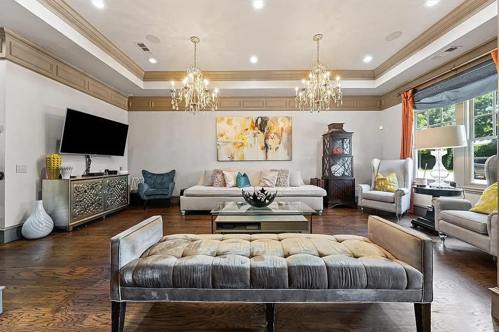 Inside the Kevin Durant former OKC townhouse for sale, the design narrative shifts toward warmth, craftsmanship, and intentional restraint. Coffered ceilings introduce architectural depth, while layered crown moldings and hardwood flooring create a cohesive material palette that feels both timeless and contemporary. The main living area, anchored by elegant chandeliers, avoids overt opulence in favor of a more refined, livable luxury.