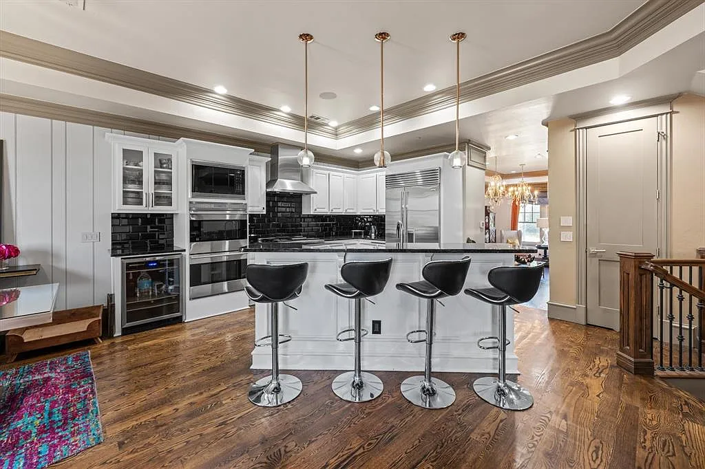 One of the most compelling aspects of the Kevin Durant former OKC townhouse for sale is its dual-kitchen configuration, a feature rarely found in comparable properties within downtown Oklahoma City real estate. The primary kitchen presents a polished aesthetic defined by white cabinetry, a glossy black subway tile backsplash, and premium stainless steel appliances, including a double oven and integrated wine storage.