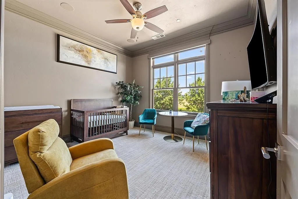 The primary suite within the Kevin Durant former OKC townhouse for sale is designed as a quiet sanctuary within the urban environment. Currently staged as a nursery, the room’s proportions and finishes clearly reveal its role as the home’s principal bedroom. Soft carpeting, neutral tones, and expansive windows establish a calming atmosphere, while the adjacent walk-in closet—with floor-to-ceiling built-ins—underscores a commitment to both organization and luxury.