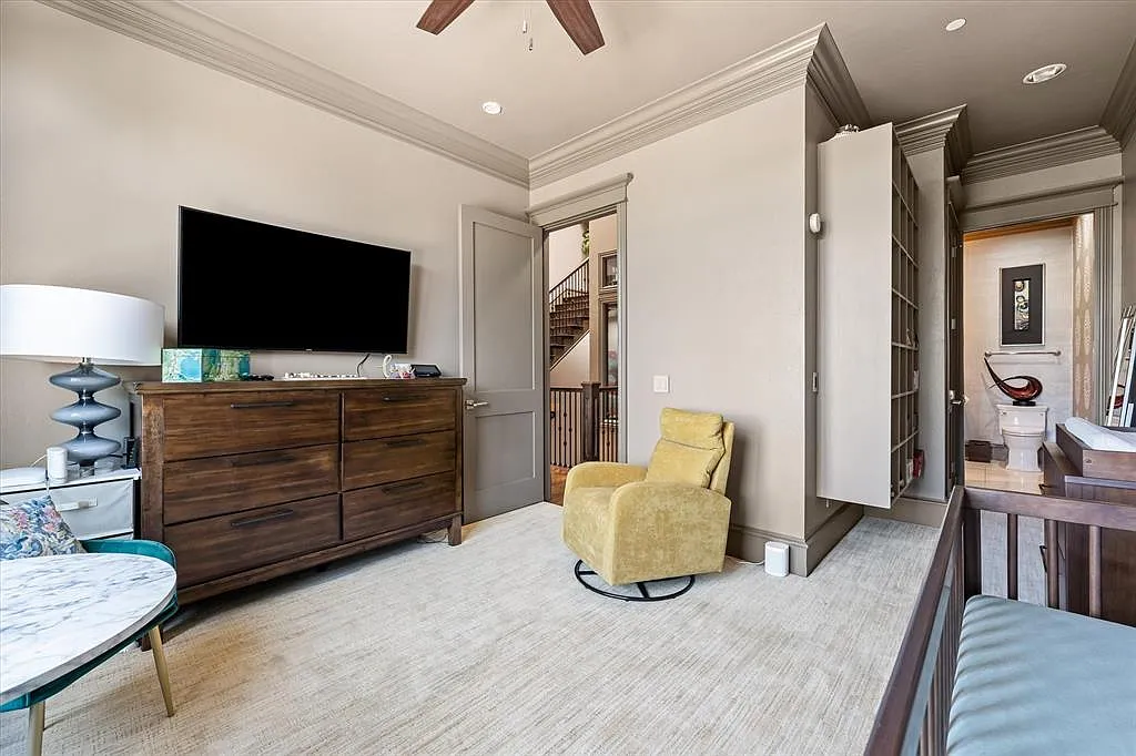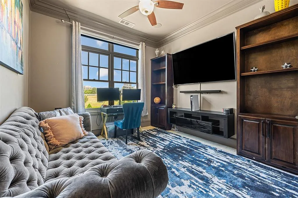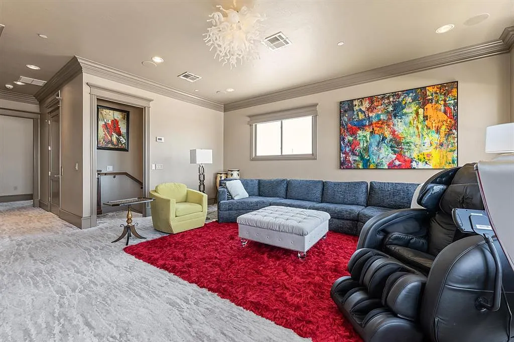 Ascending to the top level, the Kevin Durant former OKC townhouse for sale transitions into a dedicated entertainment and lifestyle zone. The home theater, complete with an oversized sectional and integrated media system, forms the centerpiece of this space. Subtle design choices, including bold accent elements and controlled lighting, enhance the cinematic experience without overwhelming the overall aesthetic.