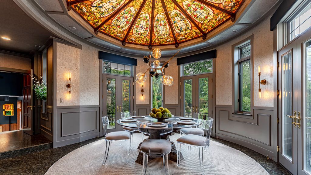 Beyond the residence itself, the estate’s grounds contribute significantly to its appeal. The property spans more than 12 acres and features over 200,000 trees planted by a previous owner, creating a park-like setting that offers both privacy and natural beauty.