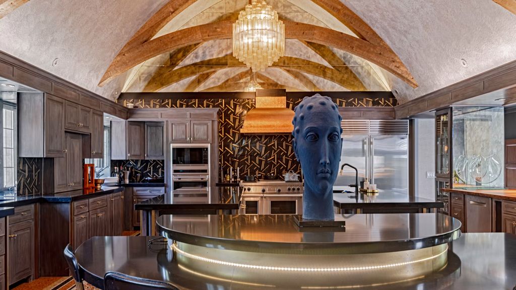 One of the most distinctive features of the property is its 3,000-square-foot entertainment complex, designed to evoke the atmosphere of a private members’ club. This space includes a wine cellar, a music studio, a hookah lounge, and a cocktail bar anchored by a striking display: a Harley-Davidson motorcycle encased in glass.