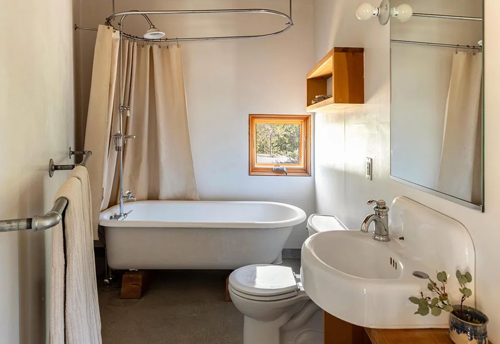The home’s two bathrooms continue the minimalist approach, including a serene porcelain bathtub set against views of the surrounding woods. Every detail pushes toward simplicity, with natural materials dominating the palette and craftsmanship taking center stage.
