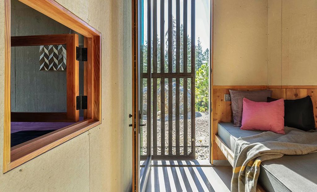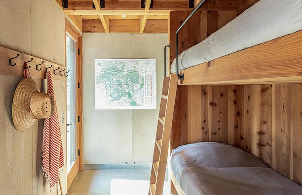 Although designed as a private creative haven, the Mountain House also welcomes community. One of its defining features is the expansive shaded roof room: an open-air deck topped by exposed beams that frame sky views while providing shelter from the elements. Outfitted with hammocks and space for a large dining table, this upper-level environment serves as a social hub for meals, conversations, and late-night gatherings under the stars.