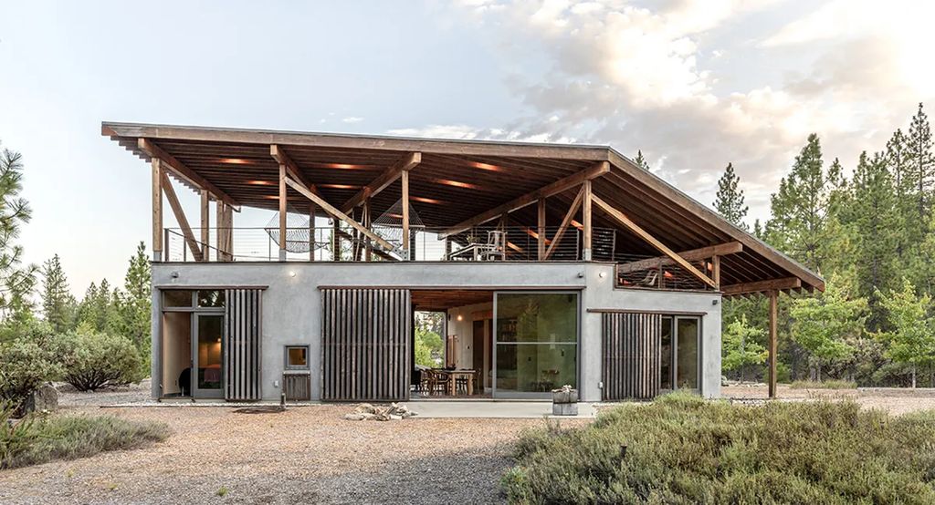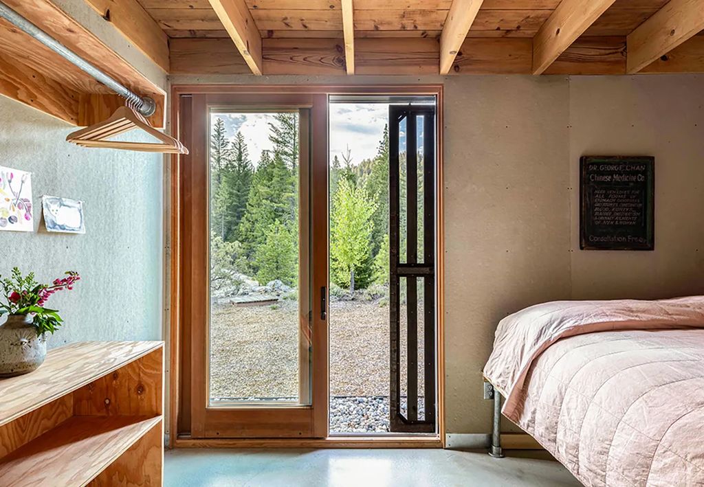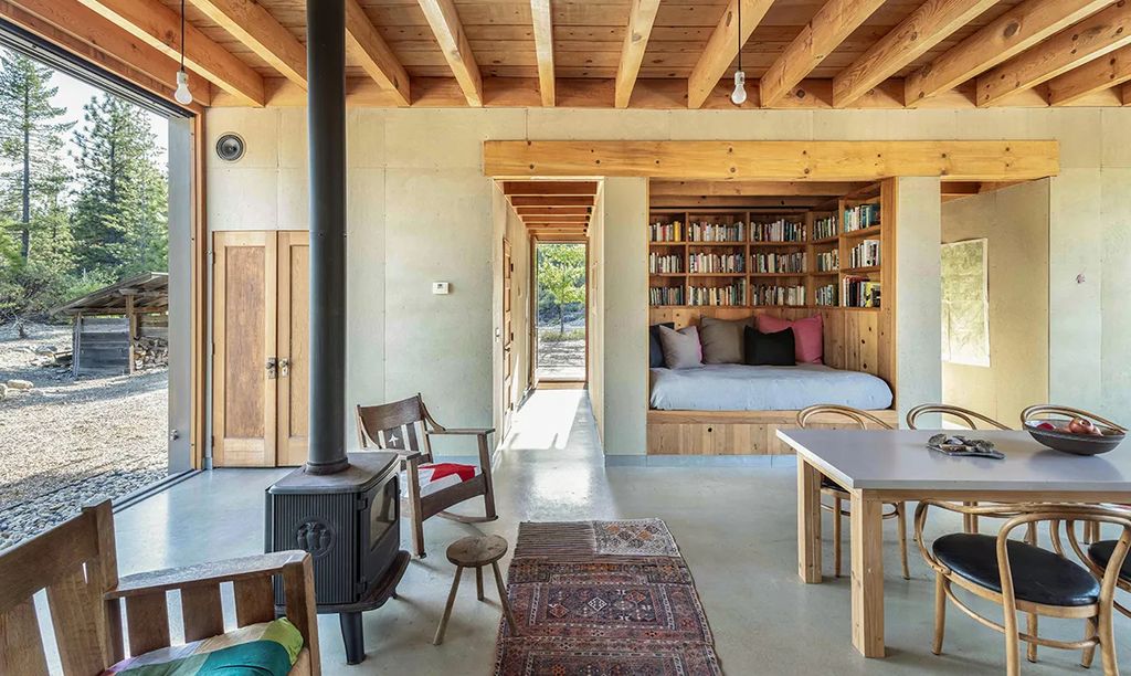 The home’s compact footprint—approximately 2,200 square feet—belies its sense of expansiveness. Its timber frame rises at a dramatic angle, creating an expressive silhouette that mirrors the surrounding mountains. Concrete floors run uninterrupted through the main level, while the interior walls are crafted from Homasote, a sustainable recycled-paper material that adds texture and softness.