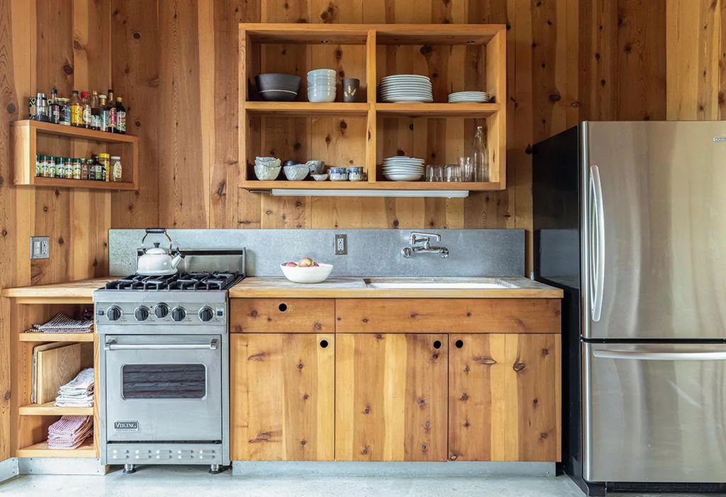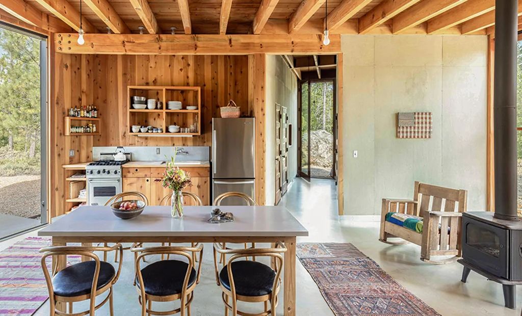 Large wood-framed sliding glass doors dissolve the barrier between interior spaces and the landscape, allowing the forest to become a living extension of the home. Every corner features tucked-away nooks designed for reading, resting, or simply absorbing the quiet. The living room centers around a wood-burning stove, adding comfort during winter months, while the adjacent dining space flows into a streamlined kitchen outfitted with open shelving and stainless-steel appliances.