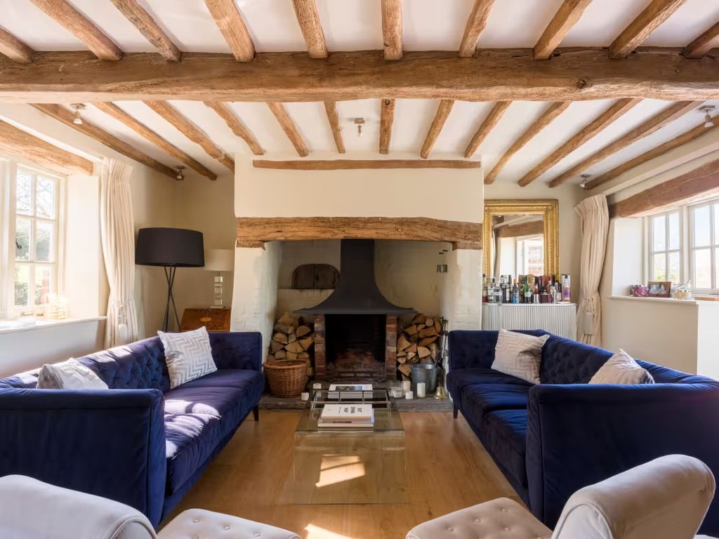 Beyond the formal dining room lies the oldest section of the property, dating to the early 17th century. Here, two reception rooms—currently used as a music room and a drawing room—feature exposed wooden beams and a traditional inglenook fireplace. These architectural elements offer a tangible connection to the home’s origins, creating spaces that feel both intimate and historically rich.