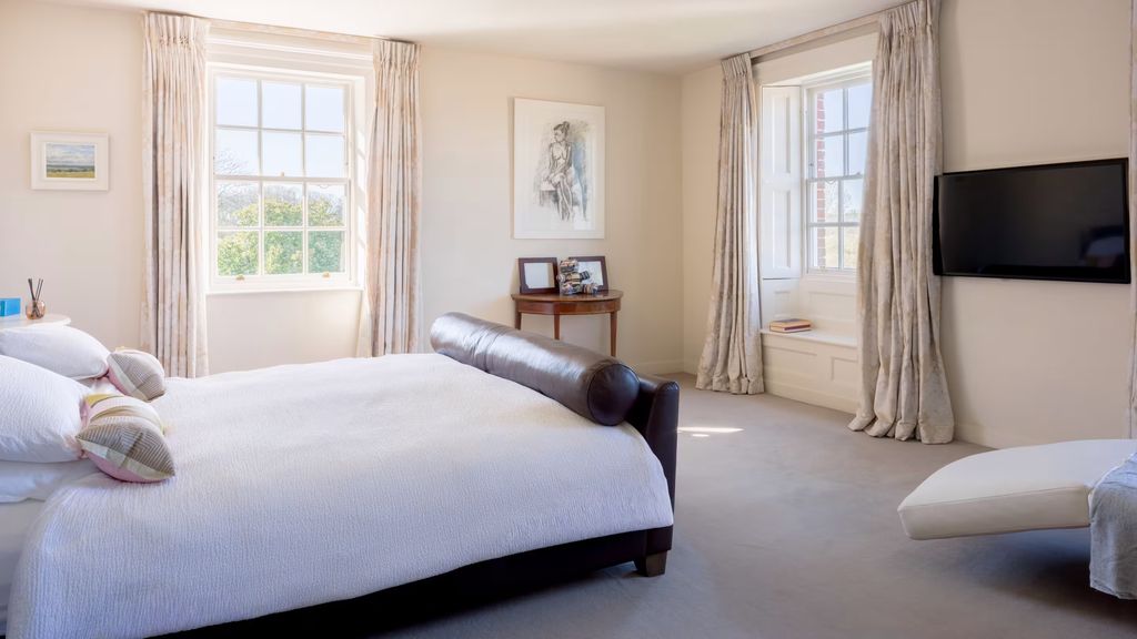The home’s six bedrooms are arranged across the upper floors, offering both privacy and flexibility. Five bedrooms occupy the second floor, while an additional bedroom is located on the top level. The primary suite stands apart, occupying its own private wing complete with an en suite bathroom, a dressing room, and expansive views over the surrounding countryside through six traditional sash windows.