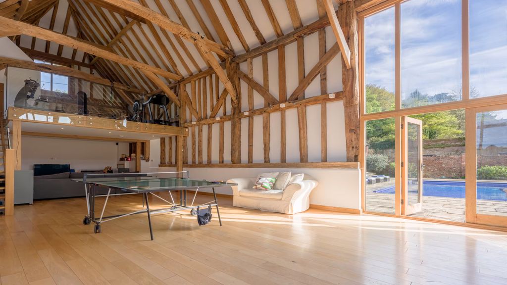 Further outbuildings include garages and stables, reflecting the property’s origins as a working homestead and offering potential for equestrian use. Such features continue to be highly desirable within the Surrey real estate market, particularly among buyers seeking a traditional English country home for sale with land and lifestyle potential.