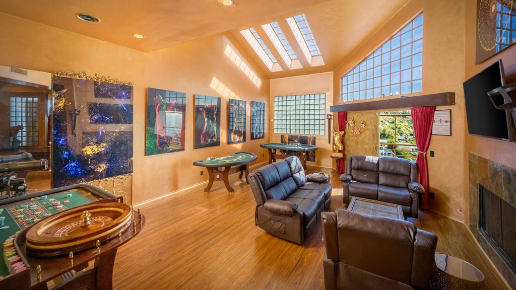 At street level, the Sunset Plaza Los Angeles home for sale presents a relatively conventional façade, complete with a kitchen, communal living areas, and a garage. A sunlit living room with expansive skylights offers a calm introduction before the home descends into increasingly surreal territory.