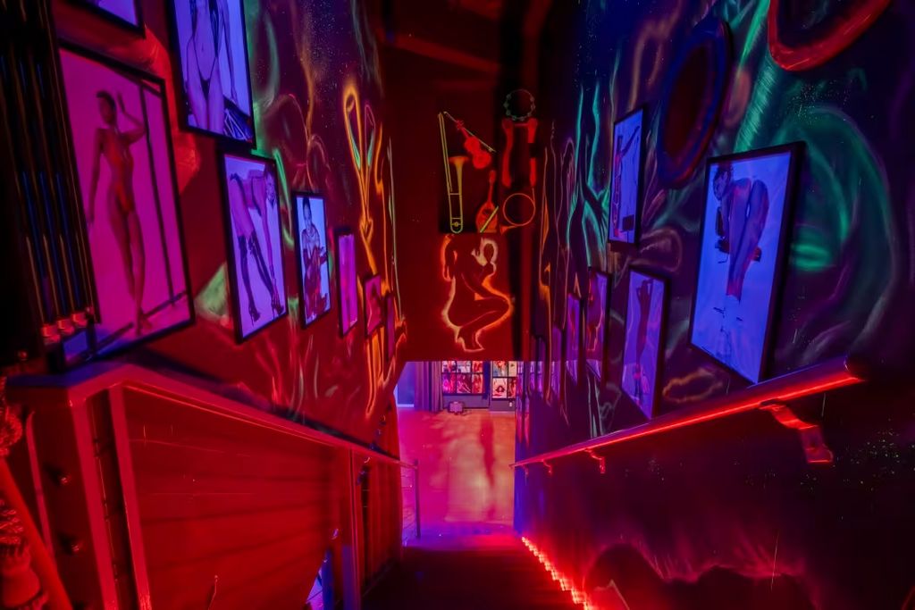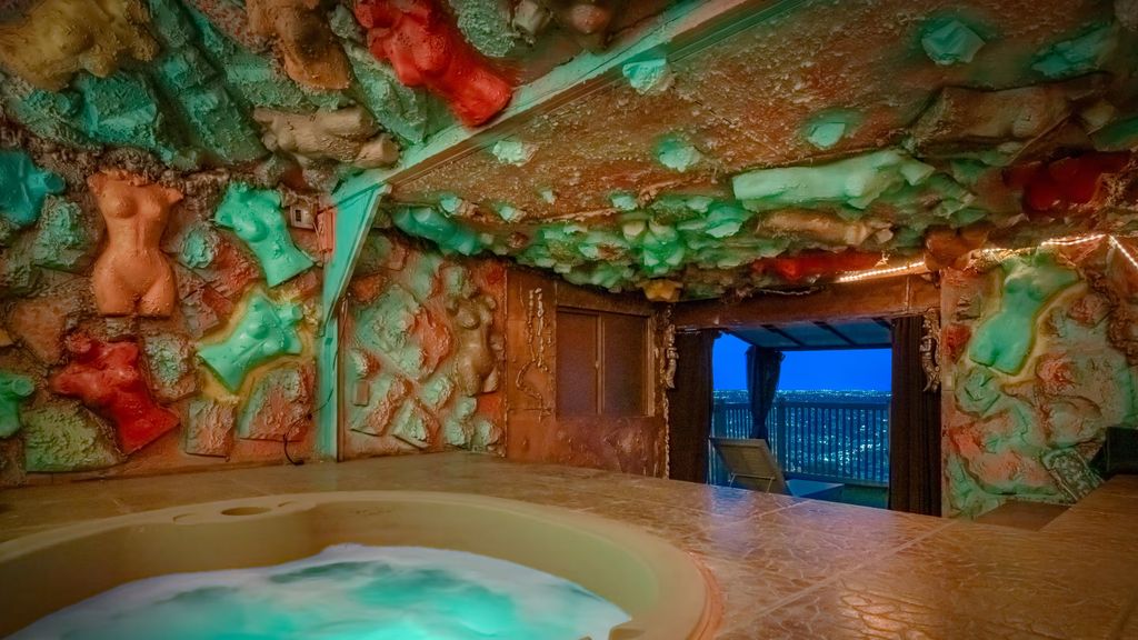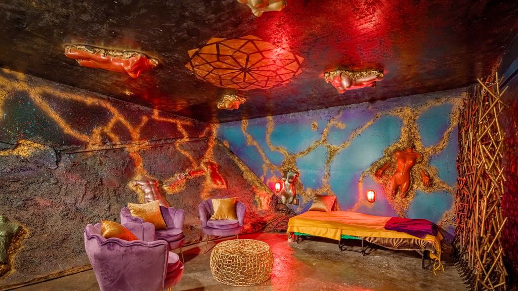 Descending into the lower levels reveals a sequence of themed environments: a red-lit studio with a celestial ceiling, a gold-etched cave paired with a matching gilded bathroom, and perhaps most strikingly, a grotto constructed from plaster torsos instead of natural rock formations.