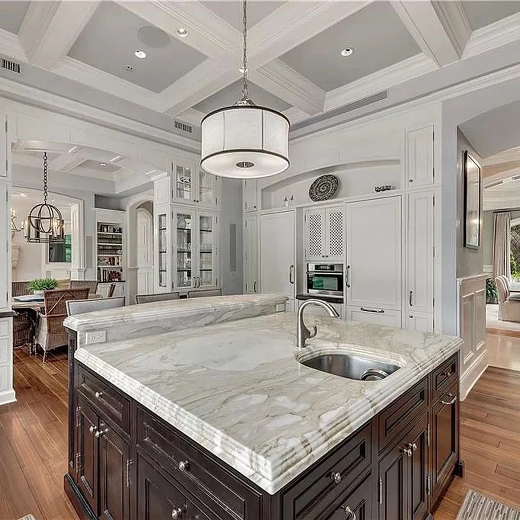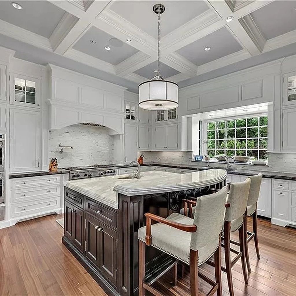 The chef’s kitchen is a showcase of form and function. Outfitted with premium appliances, marble countertops, and bespoke cabinetry, it is both a workspace and a visual delight. A large center island with seating offers the perfect gathering place for family breakfasts or casual conversations, while double ovens and a six-burner gas range cater to serious culinary ambitions.