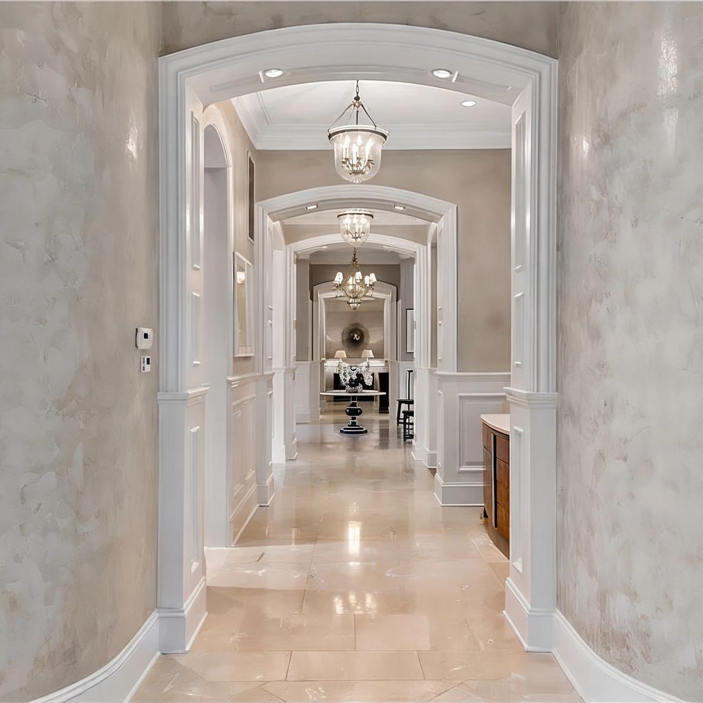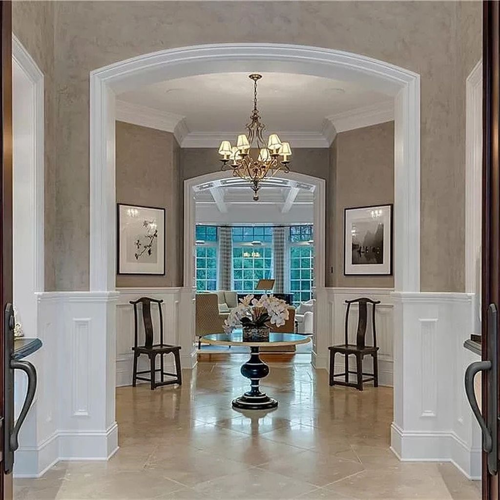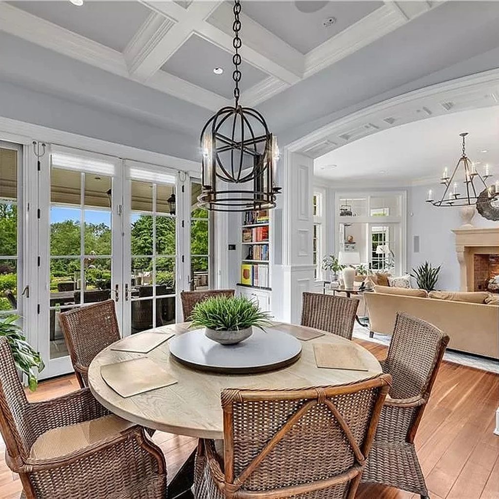 The design effortlessly merges classical elegance with modern sophistication. Neutral tones are layered with rich textures, offering a canvas where fine art and designer furniture co-exist with comfort and functionality. The adjoining dining area, defined by coffered ceilings and French doors, creates a seamless flow for entertaining.