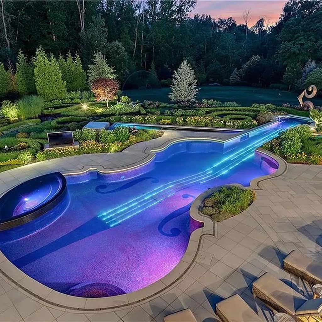 Nestled in the affluent town of Bedford, New York, this one-of-a-kind mansion once owned by former Morgan Stanley Managing Director Jay Dweck is a harmonious blend of artistry and luxury. Priced at $5.5 million, the estate captivates with its meticulous attention to detail, culminating in an extraordinary violin-shaped pool that pays tribute to Dweck’s lifelong passion for music and engineering precision.