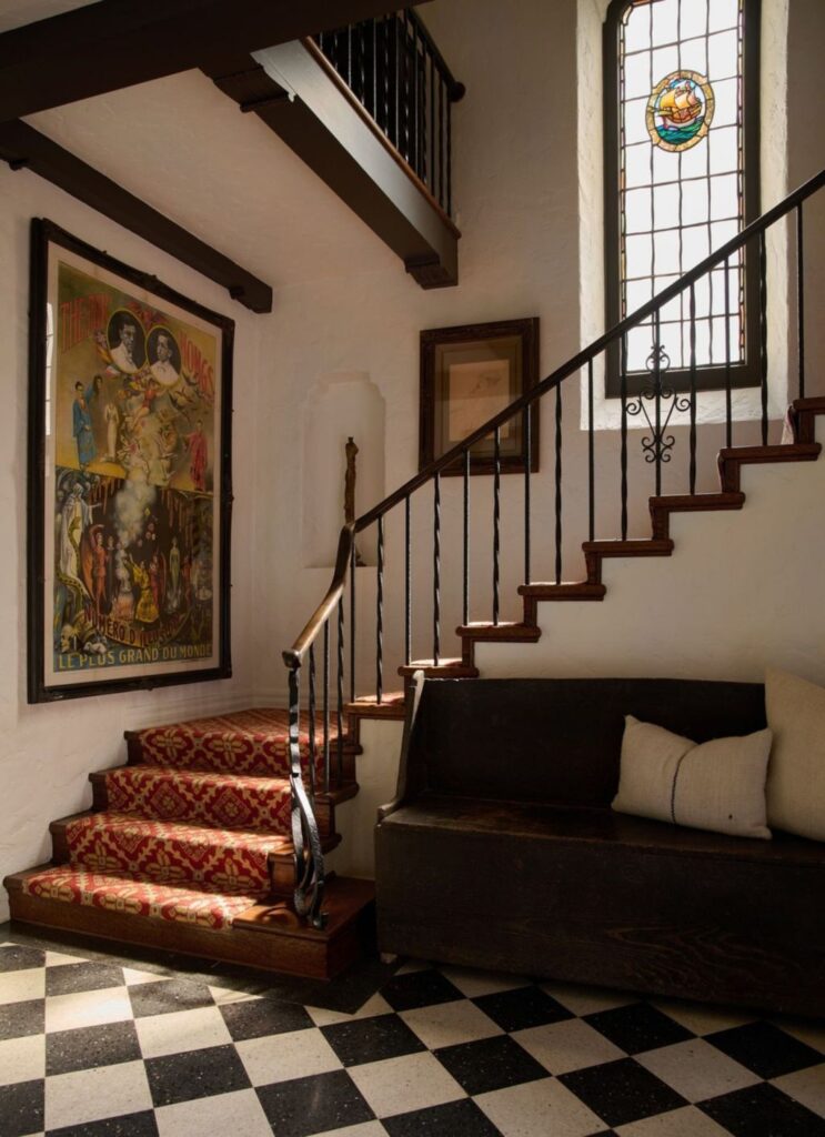 Upon entry, checkerboard tile floors immediately ground the space in its early-20th-century origins, while a carved staircase and stained-glass window introduce a sense of handcrafted artistry. The living room, anchored by soaring original wood beams, centers around a fireplace framed by arched windows and French doors, allowing natural light to soften the home’s darker timber tones.