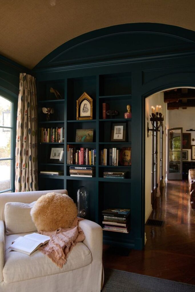 A paneled den, wrapped in floor-to-ceiling built-ins painted a deep green, offers a more intimate retreat, ideal for reading or evening conversation. Elsewhere, the updated eat-in kitchen balances professional-grade appliances with open shelving, rich cabinetry, and subtle patterning that nods to the home’s romantic roots. Glass doors open directly to an outdoor dining patio, reinforcing the seamless indoor-outdoor connection Los Angeles living is known for.