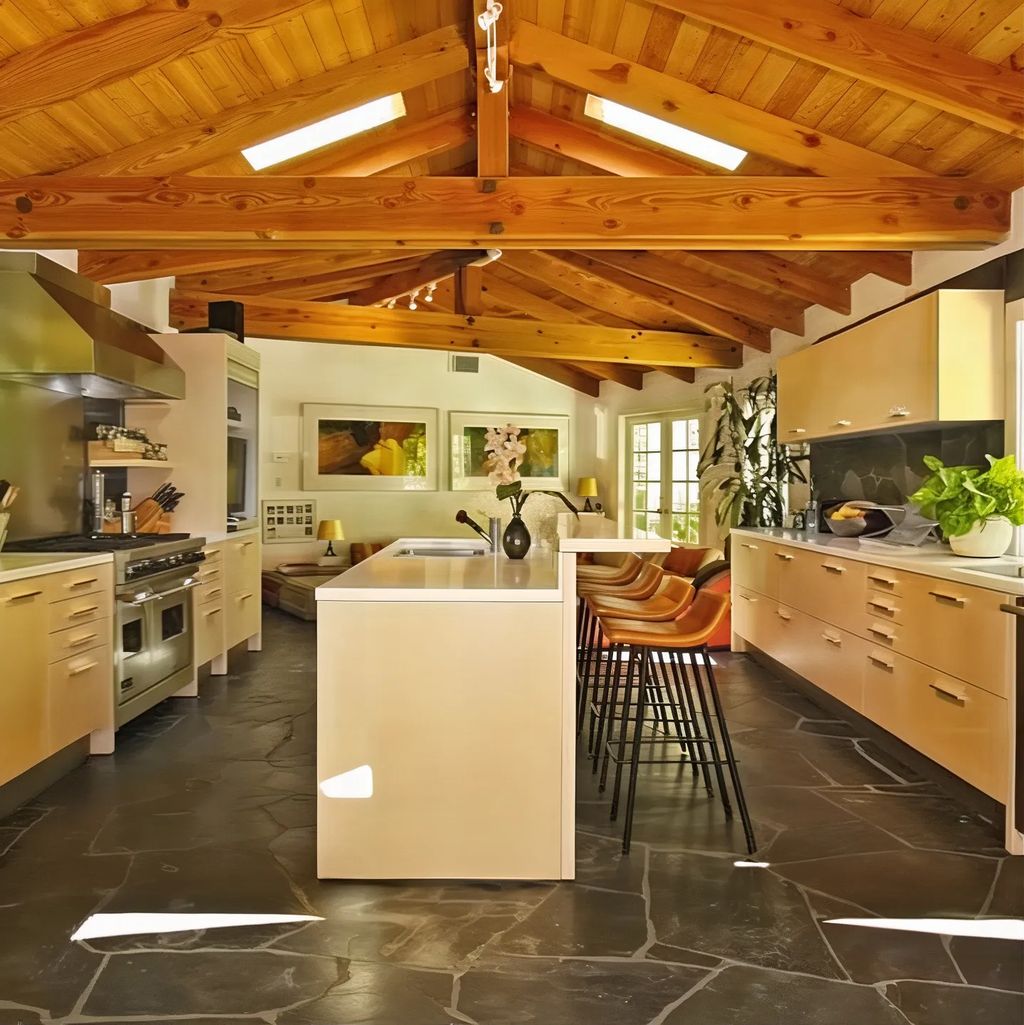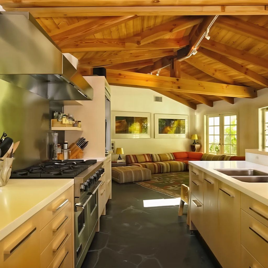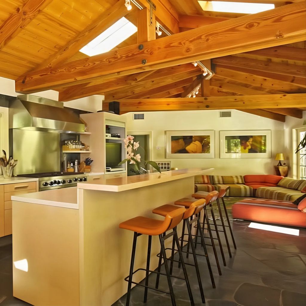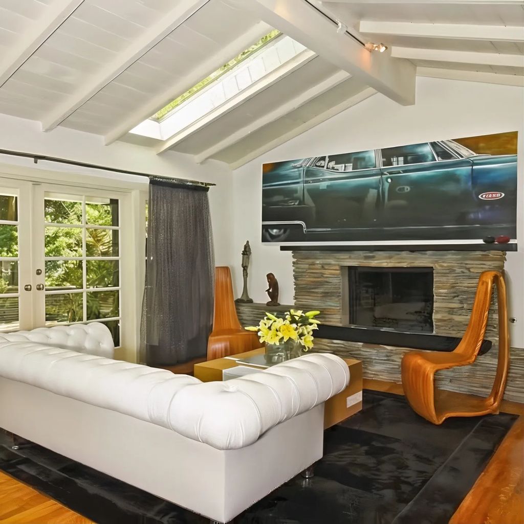Inside, the home’s interiors are bathed in natural light, with large windows and French doors framing leafy views and inviting the outdoors in. The living room is anchored by a stone fireplace, offering a sense of old-Hollywood charm, while high ceilings and warm hardwood floors bring a contemporary edge.
