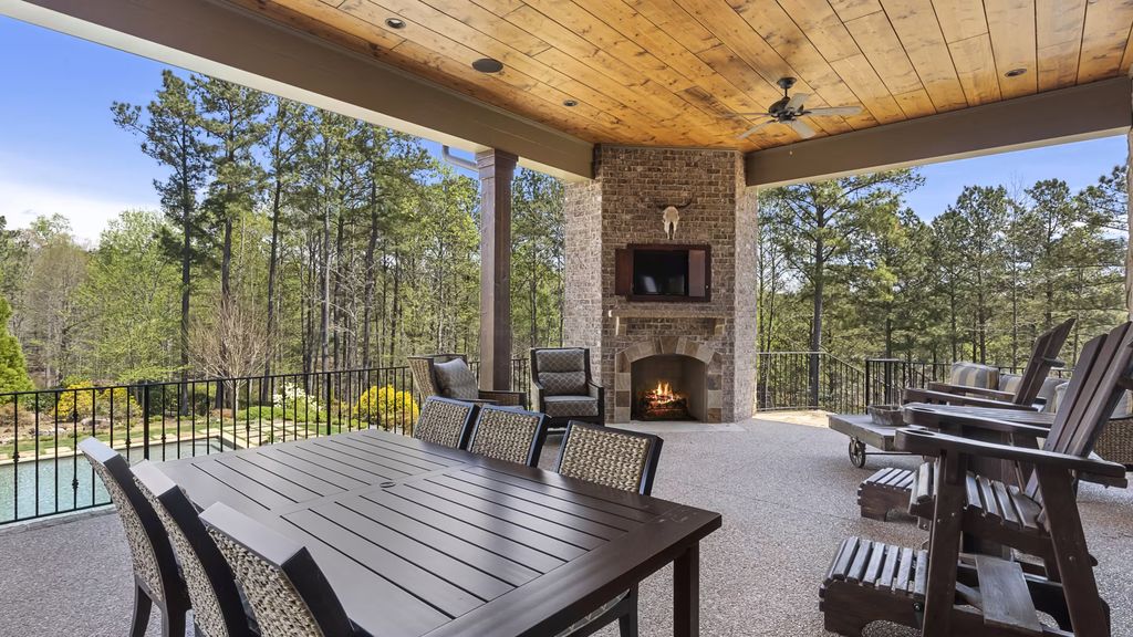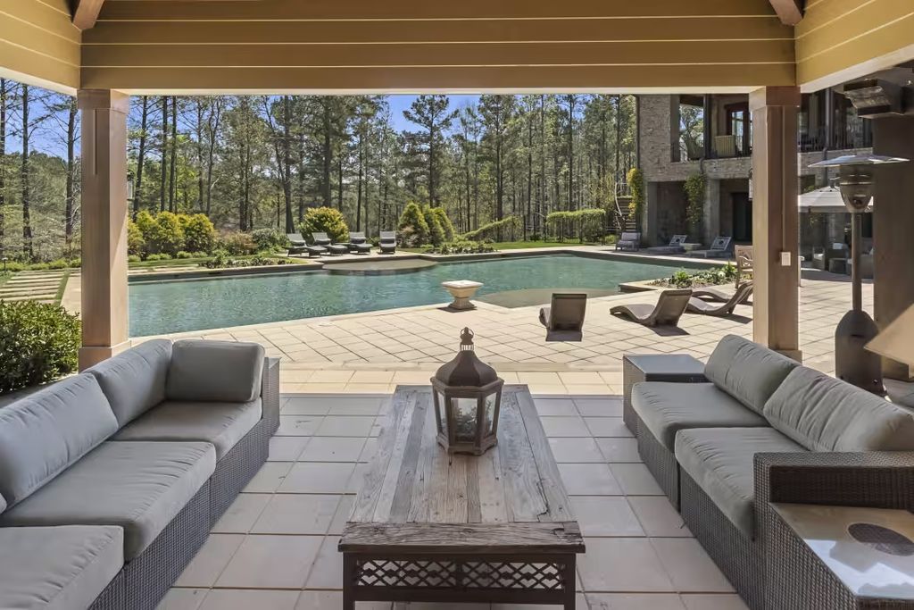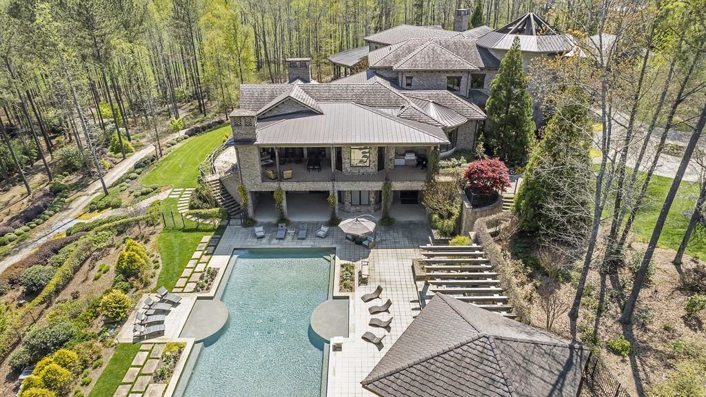 While the interiors are expansive, it is the grounds that truly distinguish the Georgia mansion. The 37-acre property is dotted with outdoor living spaces, including multiple terraces and fireplaces designed for year-round use. A heated Olympic-sized swimming pool sits adjacent to a large cabana, creating a resort-like focal point within the landscape.
