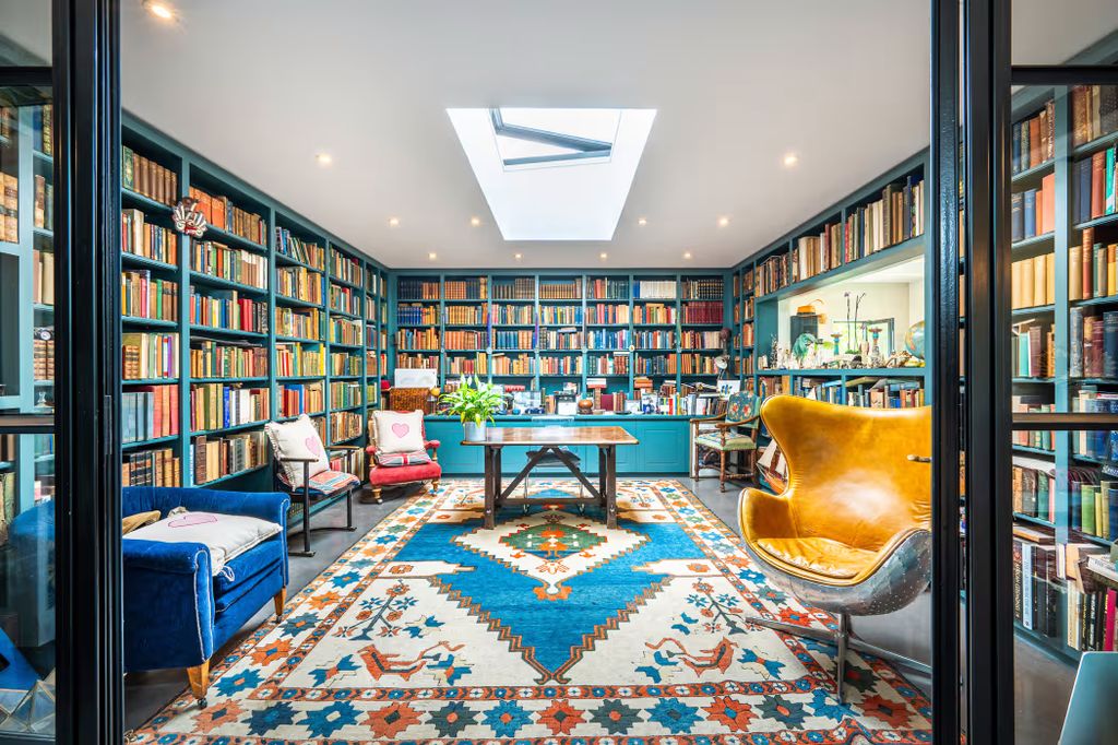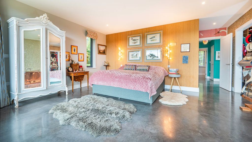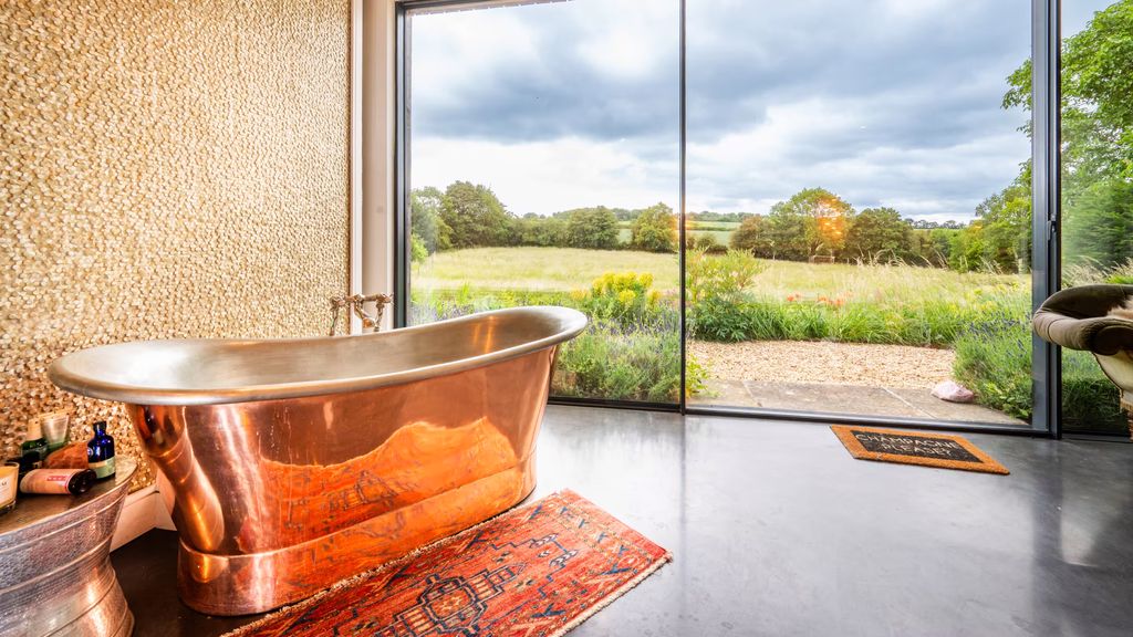 Beyond the central living area, the residence unfolds into a series of thoughtfully designed spaces, including a formal sitting room and a library lined with floor-to-ceiling shelving. These quieter zones provide contrast to the openness of the main living space, offering moments of retreat within the broader composition of the home. The property includes five bedrooms, one of which is currently configured as a study, further reinforcing its flexibility as a modern countryside home for sale. The primary suite, complete with a sculptural copper bathtub, introduces a layer of understated luxury that aligns with the expectations of high-end Oxfordshire real estate buyers.
