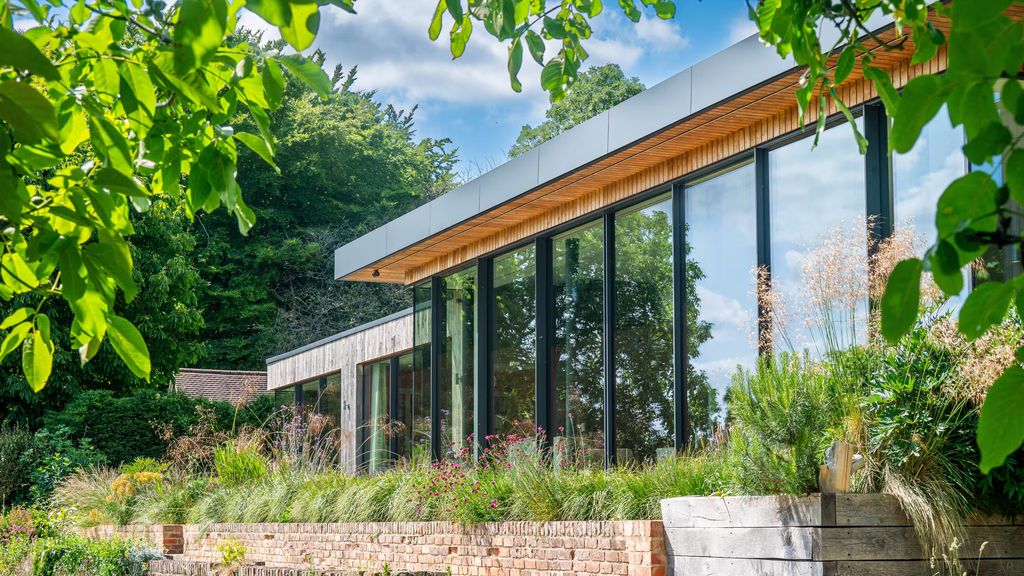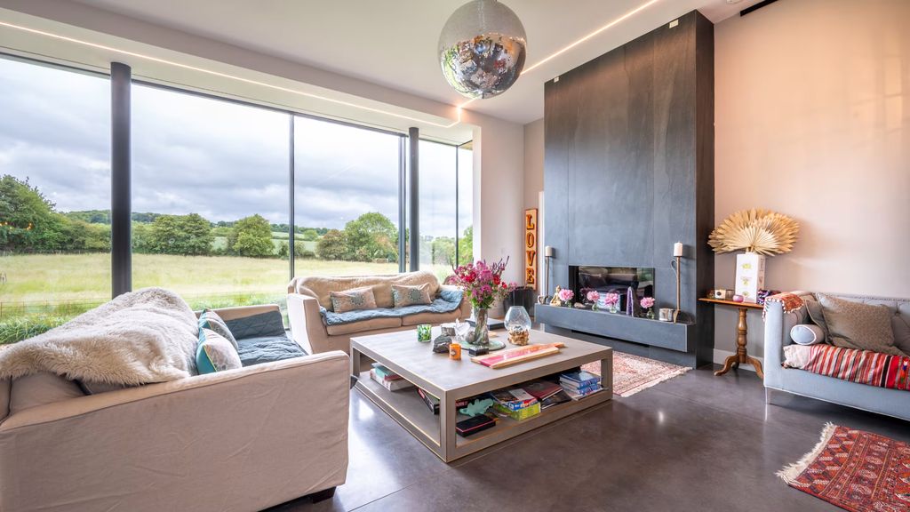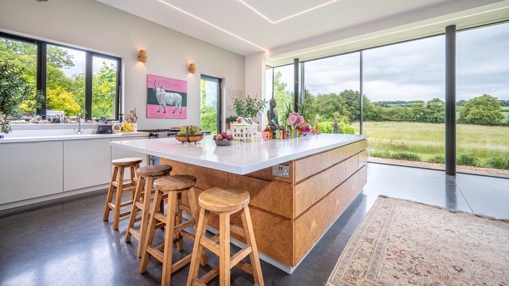 One of the home’s most striking features is its expansive glass façade, which spans an entire elevation and faces south. This design choice not only floods the interior with natural light but also creates a constant visual dialogue with the surrounding countryside, reinforcing the property’s identity as a true countryside retreat.