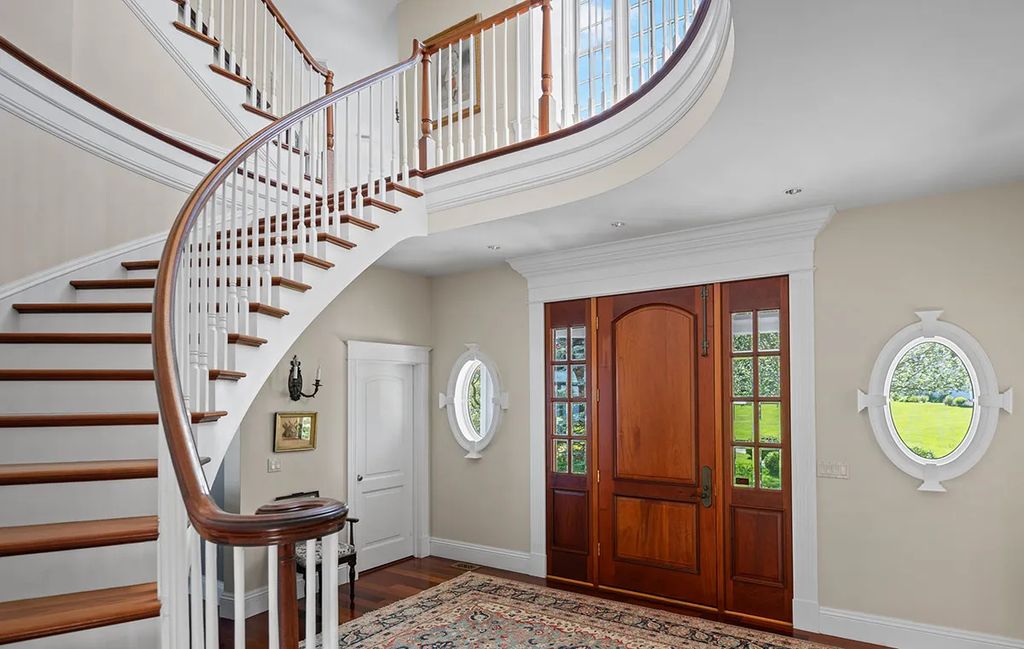The main house opens to a striking double-height foyer with a floating staircase, setting the tone for the home’s blend of elegance and comfort. The ocean-view family room, anchored by a floor-to-ceiling stone fireplace, includes a full bar—perfect for gatherings. A cozy study clad in cherry wood provides a warm retreat, while the carriage house offers additional living space for guests or staff.