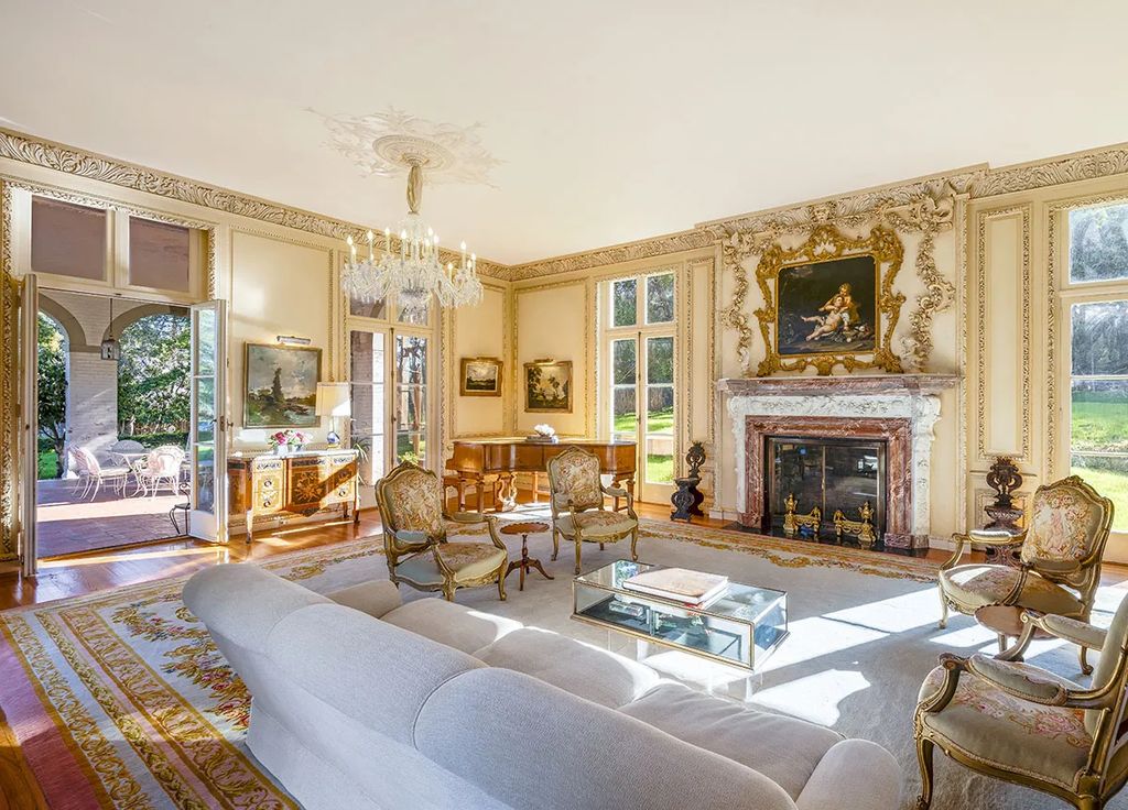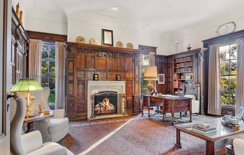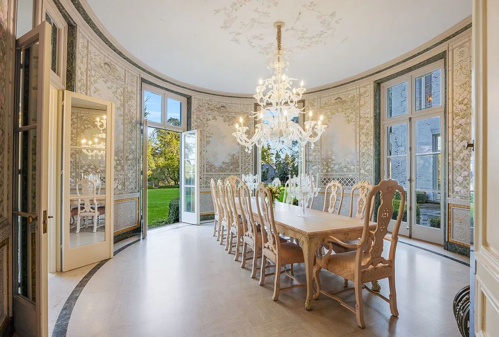 Inside, the home showcases a variety of luxurious entertaining spaces. The oval-shaped dining room is adorned with a Venetian glass chandelier and hand-painted floral motif walls, opening onto expansive lawns through elegant French doors. A formal living room with a decorative fireplace complements a wood-paneled library featuring built-in bookcases and an additional fireplace. A bar-equipped smoking room further reflects the estate’s old-Hollywood sophistication.