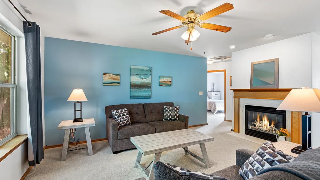 At the heart of Bird Point is the main residence, a traditional-style home covering nearly 5,000 square feet. Inside, five bedrooms and four bathrooms provide spacious comfort, while a dramatic stone fireplace anchors the family room. Light wood finishes enhance the kitchen and dining areas, and nearly every room frames breathtaking views of Flathead Lake. The home was designed to merge contemporary luxury with Montana’s rustic character, making it equally suitable for relaxation and entertaining.