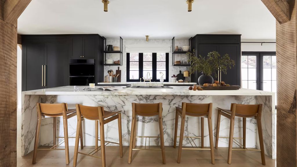 With nearly 3,000 square feet of living space, the four-bedroom, three-bath residence showcases a series of customized upgrades. The kitchen is defined by marble countertops and brass-finished cabinetry, a signature of Berk’s vibrant but elegant material palette. Floor-to-ceiling windows fill the main living areas with natural light while offering views of the surrounding hills and skyline.