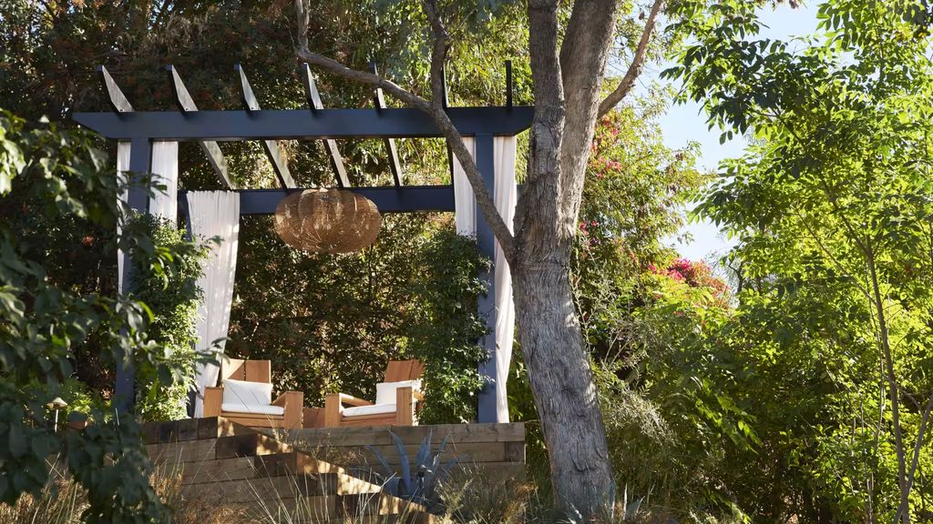 Outdoor spaces play a significant role in the property’s overall appeal. The backyard includes multiple terrace levels, perfect for al fresco dining, lounging and enjoying sunsets over the Los Angeles basin. A pergola-covered seating area and fire pit create naturally inviting zones for entertaining, while adjacent gardens soften the contemporary lines of the home with lush greenery.