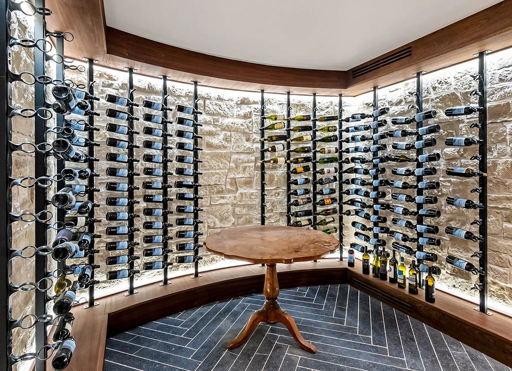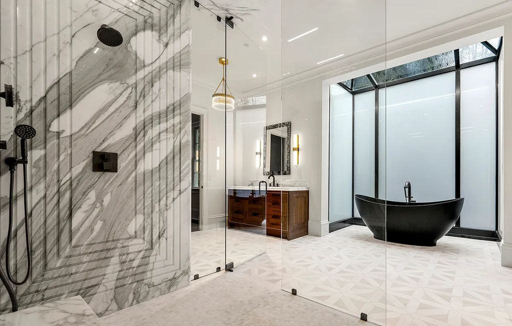 The upper level houses additional bedrooms and baths, with the vaulted primary suite standing out as a luxurious retreat. Its marble bathroom features a sauna, steam shower, and cantilevered soaking tub. Every detail reflects the intersection of classic design, comfort, and the storytelling essence of a home owned by a sports legend.