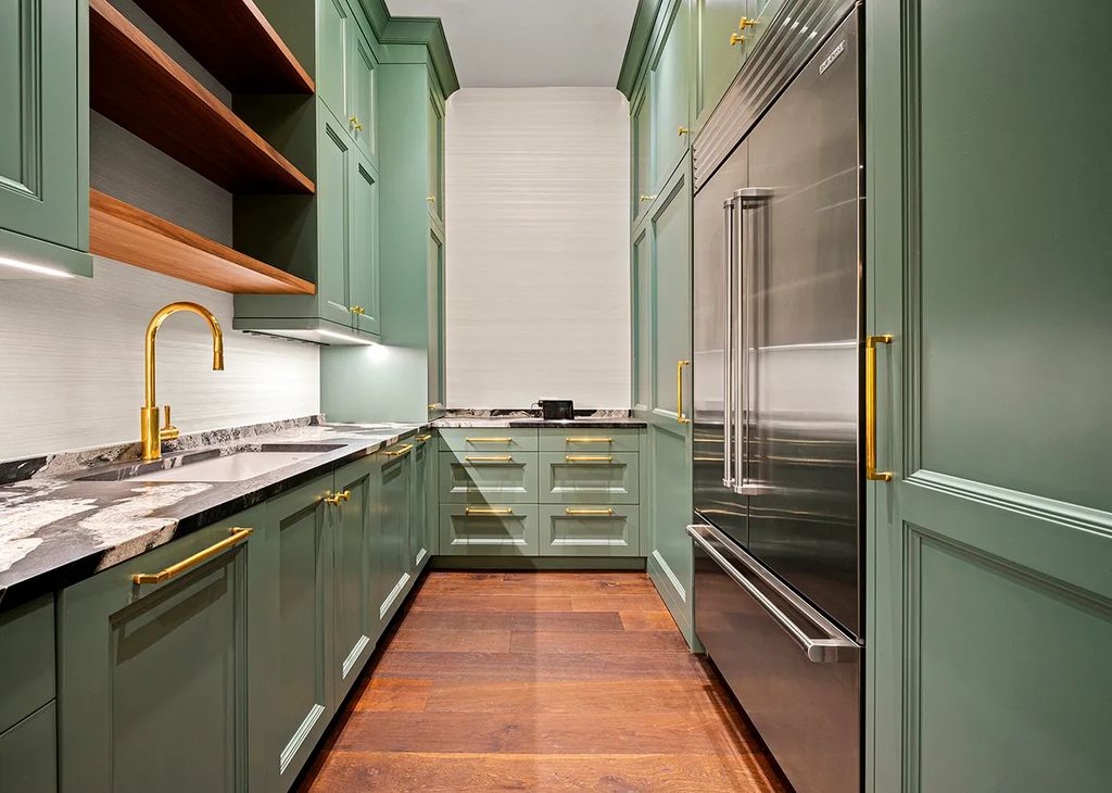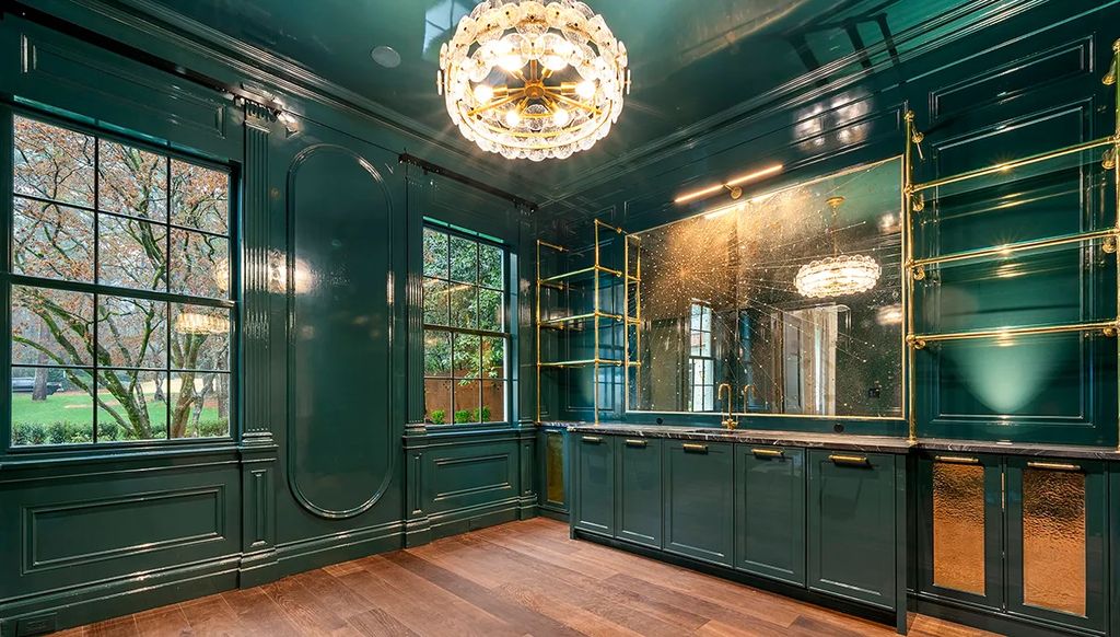 The main-level interior begins with a black-and-white tiled entrance gallery, setting a sophisticated tone. From there, formal living and dining rooms offer expansive space for hosting, while a fireside family room flows seamlessly into an eat-in kitchen equipped with a Wolf range and a prep pantry. A study, clad in century-old refurbished red oak paneling, leads to a teal-lacquered speakeasy, creating a seamless blend of private leisure and historic character.