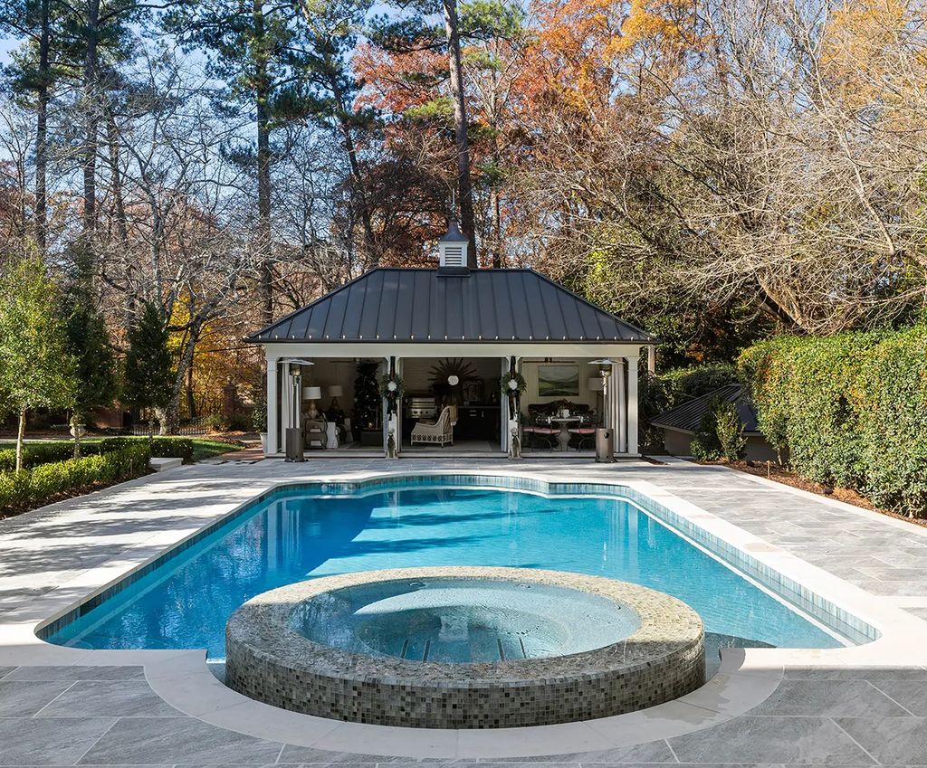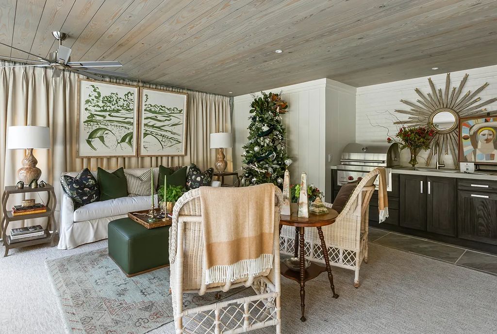 Beyond the main residence, the terrace level provides ample space for recreation and wellness. This area includes a billiards room, wine cellar, golf simulator, and a fully equipped gym. The manicured grounds feature a pool and spa surrounded by a sundeck, with an open-air cabana creating an ideal outdoor entertaining environment. A special highlight is a putting green replicating Augusta National Golf Club’s iconic No. 12 hole, paying homage to Jones’s career and connecting the property directly to the history of the Masters Tournament.