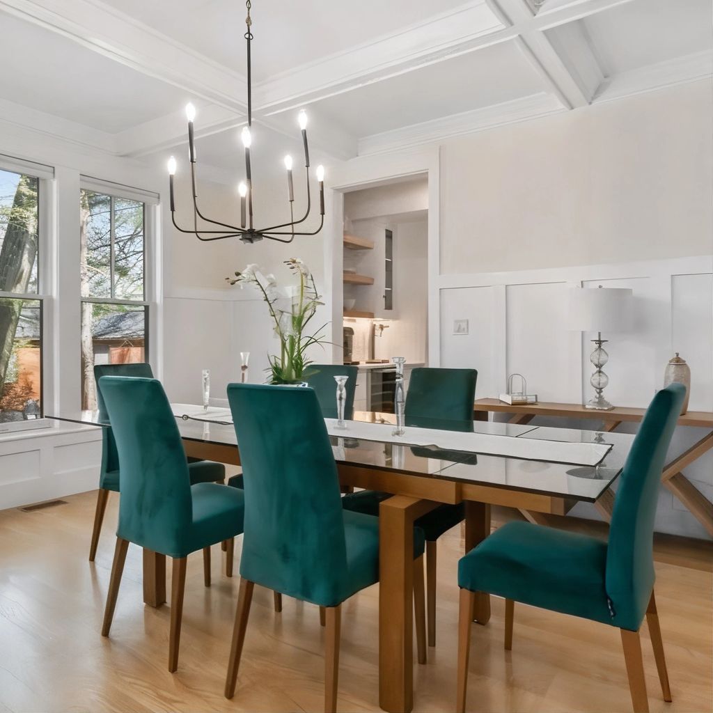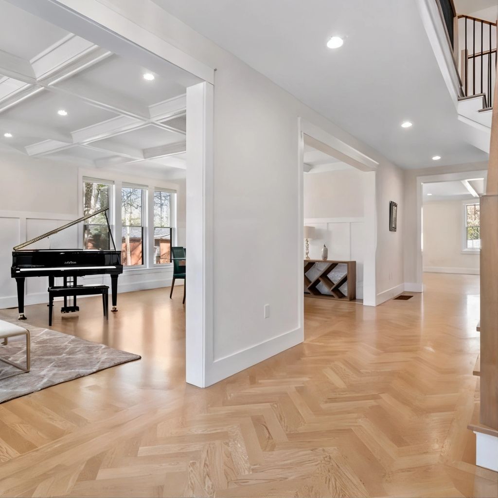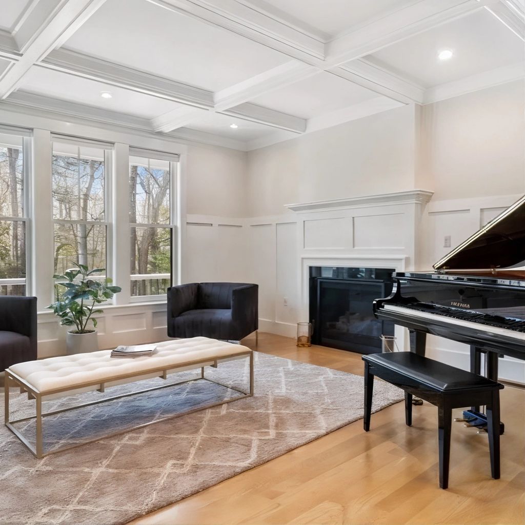 Step inside and the interiors unfold with a graceful flow that emphasizes openness and warmth. The living room, flooded with natural light from tall windows, balances soft neutral tones with clean architectural lines. Hardwood floors stretch beneath high ceilings, and a classic fireplace anchors the room, bringing both a visual and functional focal point to the space.