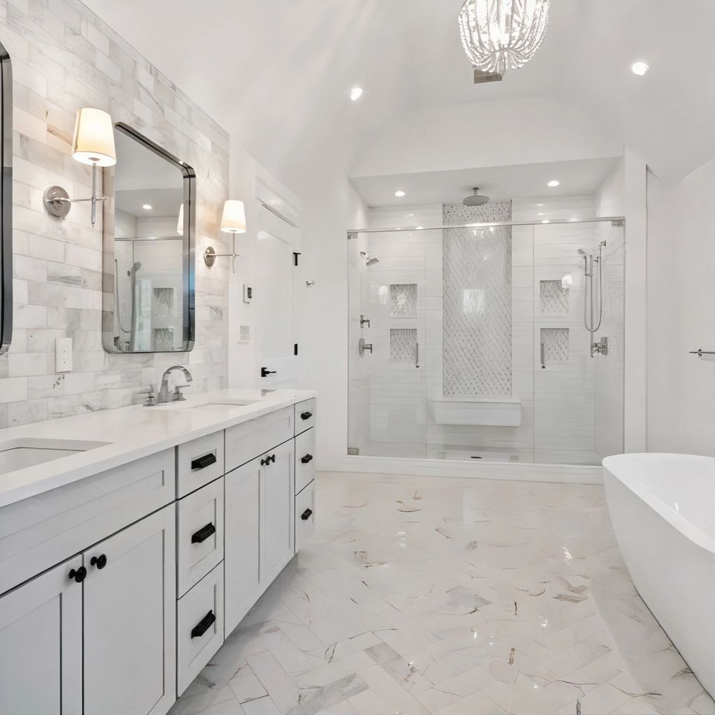 Upstairs, the primary suite serves as a luxurious private retreat. The room is airy yet cozy, thanks to soft wall tones, vaulted ceilings, and windows that overlook the serene backyard. The en suite bathroom continues the theme of understated luxury with a soaking tub, glass-enclosed shower, and dual vanities set in stone-topped counters.