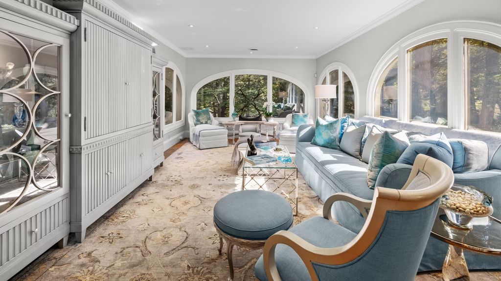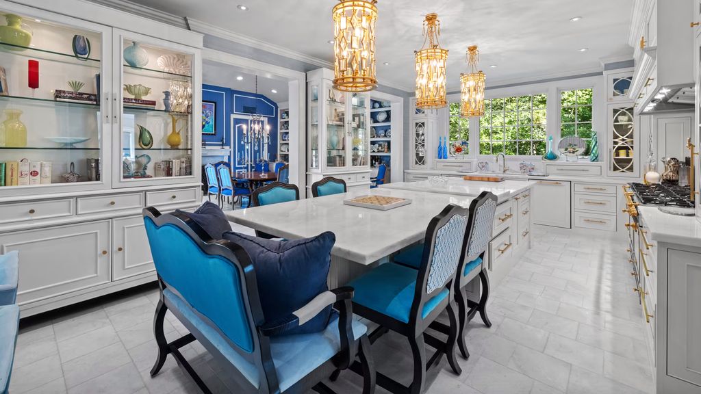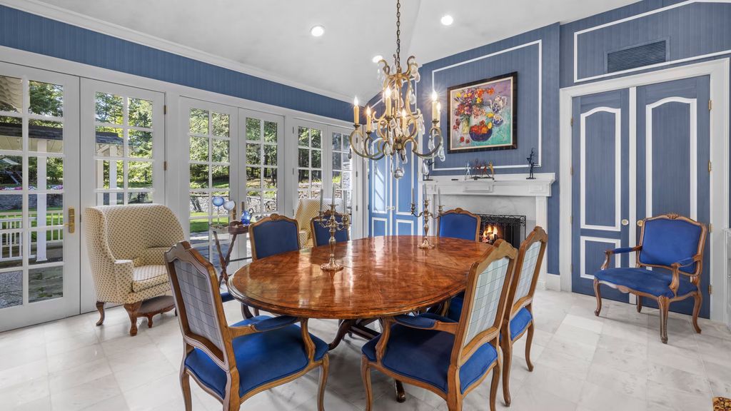 The main level unfolds with a sequence of elegant spaces, including a formal parlor, a sunroom flooded with natural light, a private office, multiple dining areas, and a library. The kitchen, however, represents a more contemporary intervention, featuring an oversized island and a premium La Cornue range.