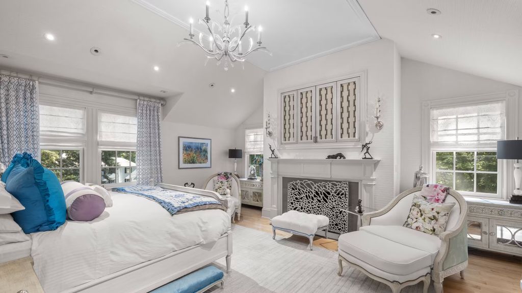 The upper levels of the Brookline Spanish Colonial mansion for sale continue to deliver a sense of scale and comfort. The second floor is anchored by a spacious primary suite featuring a marble en suite bathroom, custom dressing closets, a fireplace, and a vaulted ceiling that enhances the sense of openness.