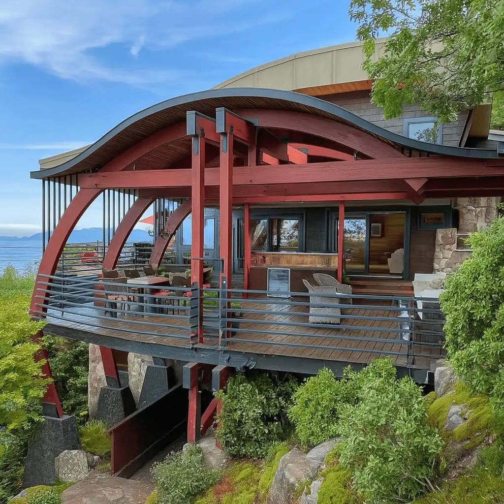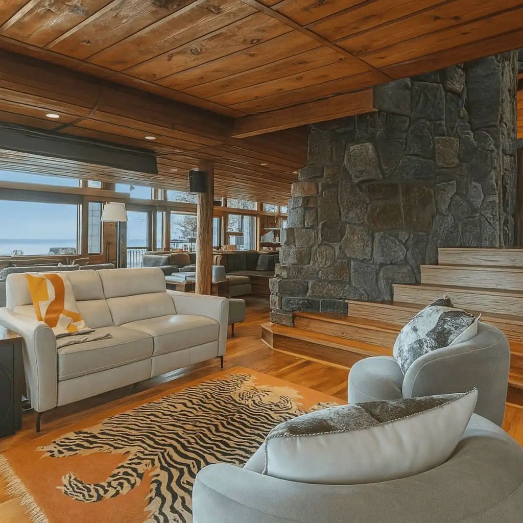 Blending rustic elegance with modern design, the residence is a striking example of organic architecture. Floor-to-ceiling windows frame panoramic forest views, while open-plan interiors foster a strong connection to nature.