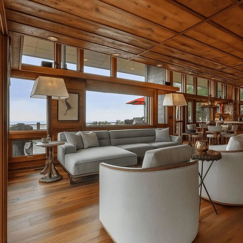 Tucked away in the scenic Blue Ridge Mountains, within the Nantahala National Forest near Highlands, the residence showcases soaring wood-paneled ceilings, sweeping glass walls, and elegantly curved architectural lines that echo its nautical influence.