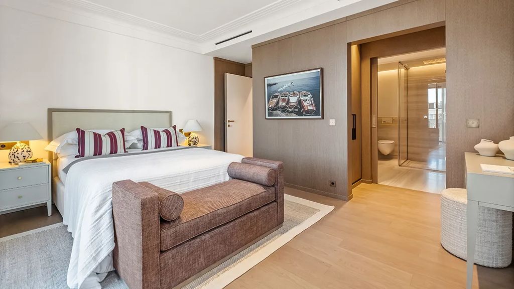 The en suite primary and guest bedrooms are accessed via a hallway and feature marble-finished bathrooms, custom vanities, walk-in dressing rooms, and direct terrace access. The third bedroom doubles as a study, providing versatility for homeowners. Each room captures sweeping views of the yacht-laden coastline, ensuring that the apartment’s historic and aesthetic value is complemented by its natural surroundings.