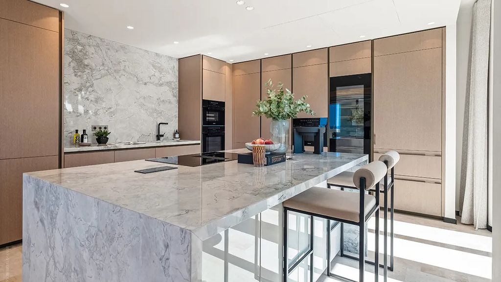 The living and dining areas flow effortlessly onto terraces and a covered loggia, creating indoor-outdoor spaces ideal for both relaxation and entertaining. Coffered ceilings add a touch of architectural elegance, while the kitchen is fully equipped with Miele appliances, timber cabinetry, and a substantial marble island, offering a perfect balance of function and style.