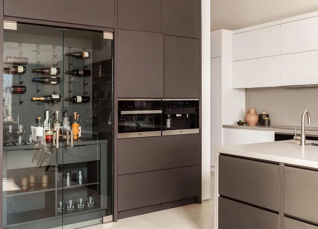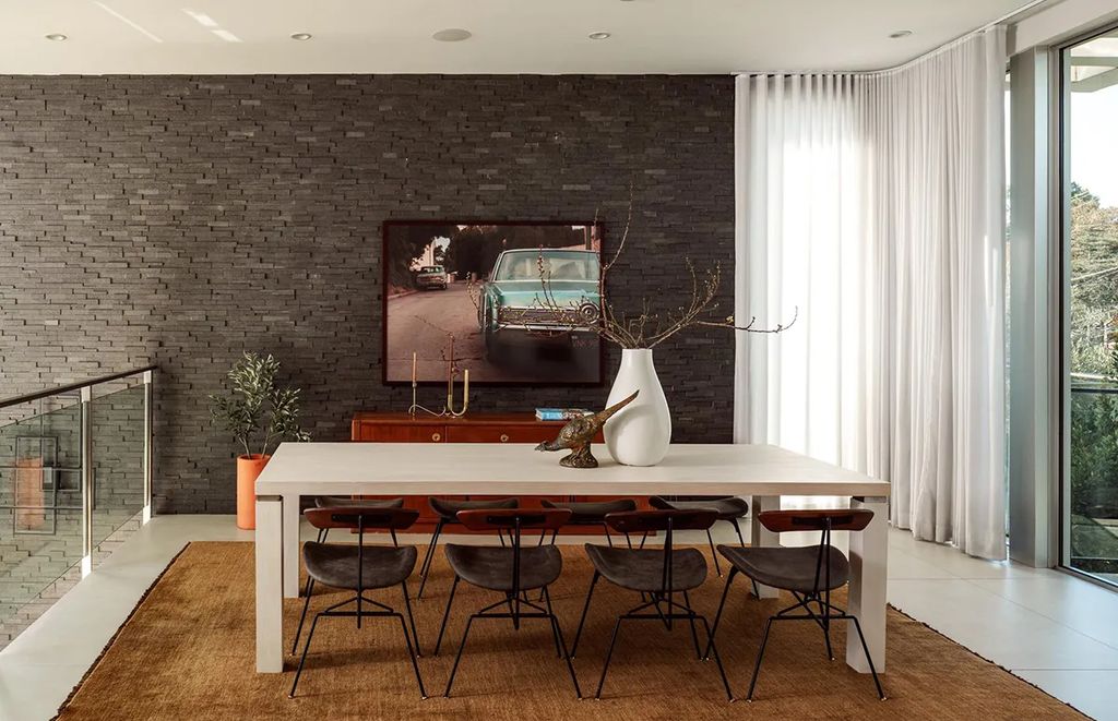 The open-plan dining area, marked by a dramatic stone accent wall, flows naturally into the gourmet kitchen. Here, a marble-topped island doubles as a breakfast table, while high-end Miele and Sub-Zero appliances elevate both form and function. It’s a kitchen that invites morning coffee as easily as dinner parties under the soft glow of the city lights.