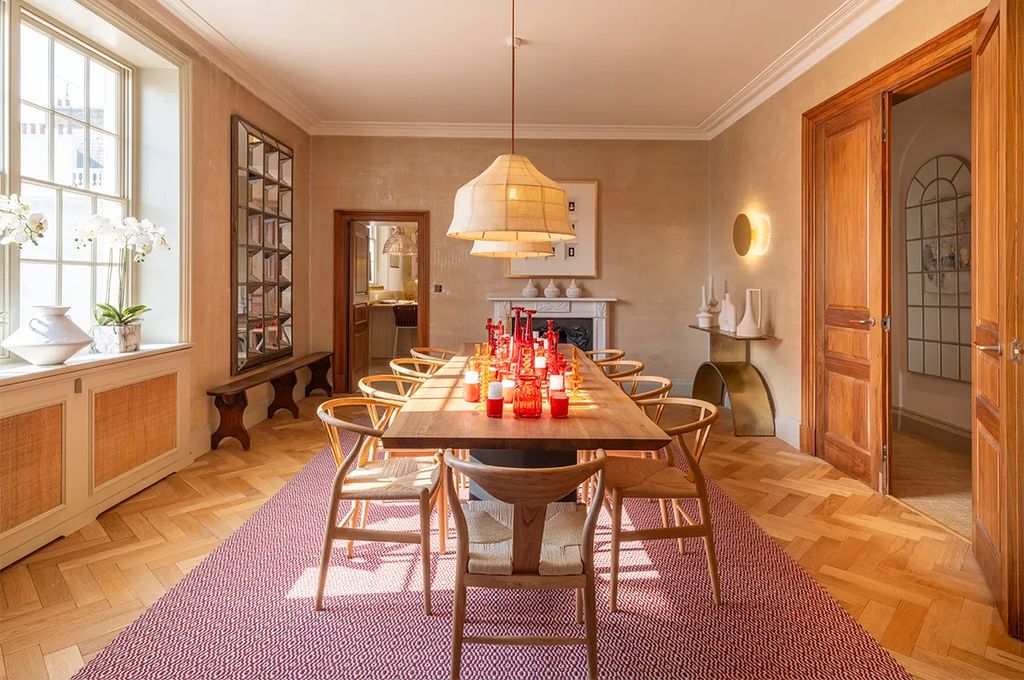 A doorway bordered with bespoke library joinery leads into an elegant dining room that seats up to ten guests. Light oak herringbone parquet floors and tall ceilings create a graceful sense of vertical space. Just beyond lies the Shaker-style kitchen, finished with yellow ceramic wall tiles, Gaggenau appliances, and a breakfast bar that makes the space feel particularly welcoming.