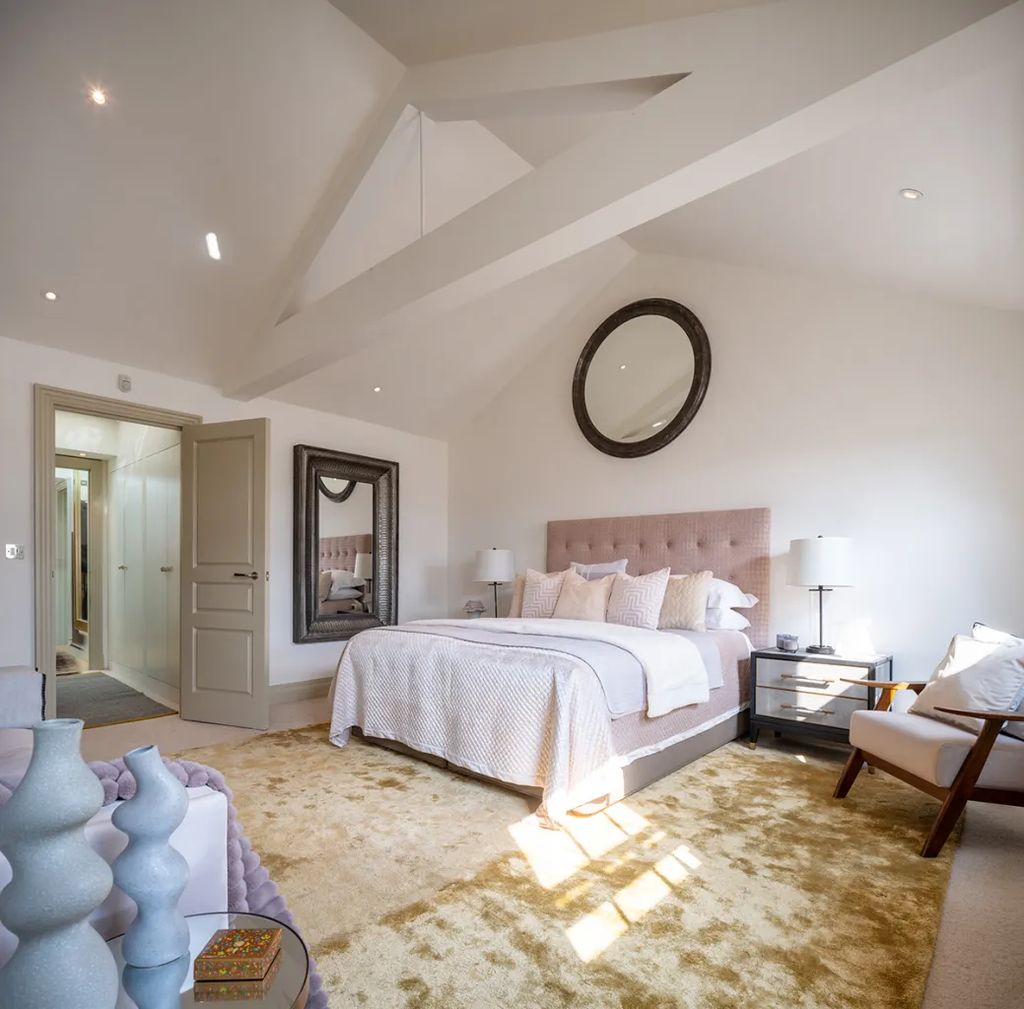 The primary bedroom suite occupies the upper floor, beneath a vaulted ceiling that adds a sense of volume and quiet drama. The en-suite marble and tile bathroom is bathed in sunlight by way of a skylight, creating an almost spa-like mood in the mornings. The dressing area, lined with built-in wardrobes, underscores this idea of private sanctuary rather than display.