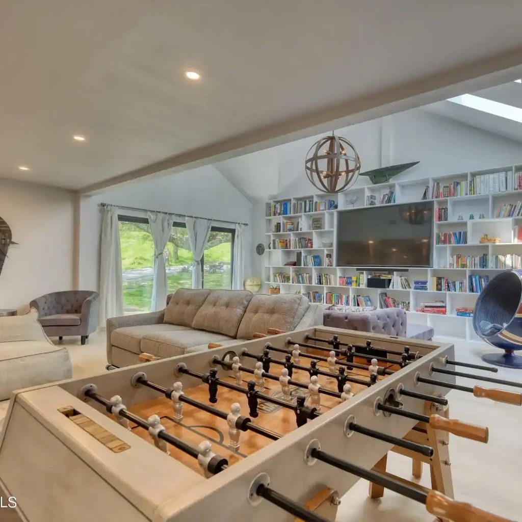 Inside the home, the main living room sets a tone of understated elegance. Original hardwood floors, exposed ceiling beams, and a grand wood-burning fireplace create a sense of authenticity and comfort. Natural light floods the space through oversized windows, while built-in shelves showcase books, art, and personal treasures. The room’s design honors the legacy of Christopher Reeve—simple, powerful, and enduring. It’s a space meant for conversation, reflection, and togetherness.