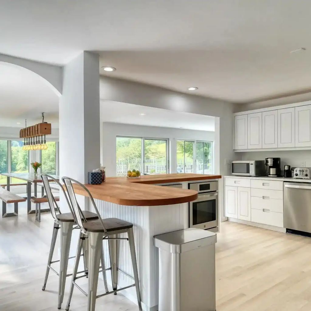 A central island encourages conversation, cooking, and community. Adjacent French doors open directly to a stone patio, inviting fresh breezes and outdoor dining. This heart-of-the-home kitchen perfectly complements the rustic luxury found in many sought-after Massachusetts homes for sale.