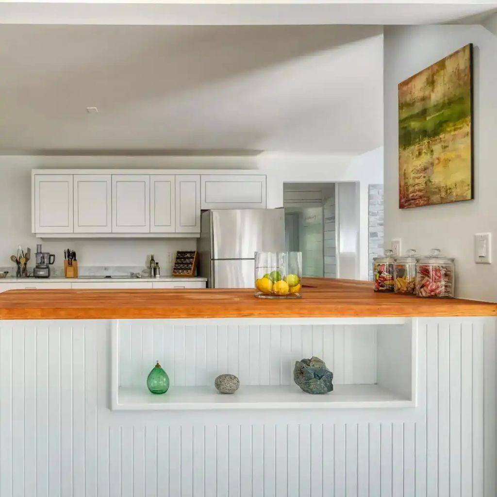 The kitchen is both practical and poetic. With its creamy custom cabinetry, butcher block countertops, and handcrafted hardware, the space echoes traditional farmhouse aesthetics. A rustic wood-burning stove shares the room with state-of-the-art appliances, combining old-world charm with modern convenience.