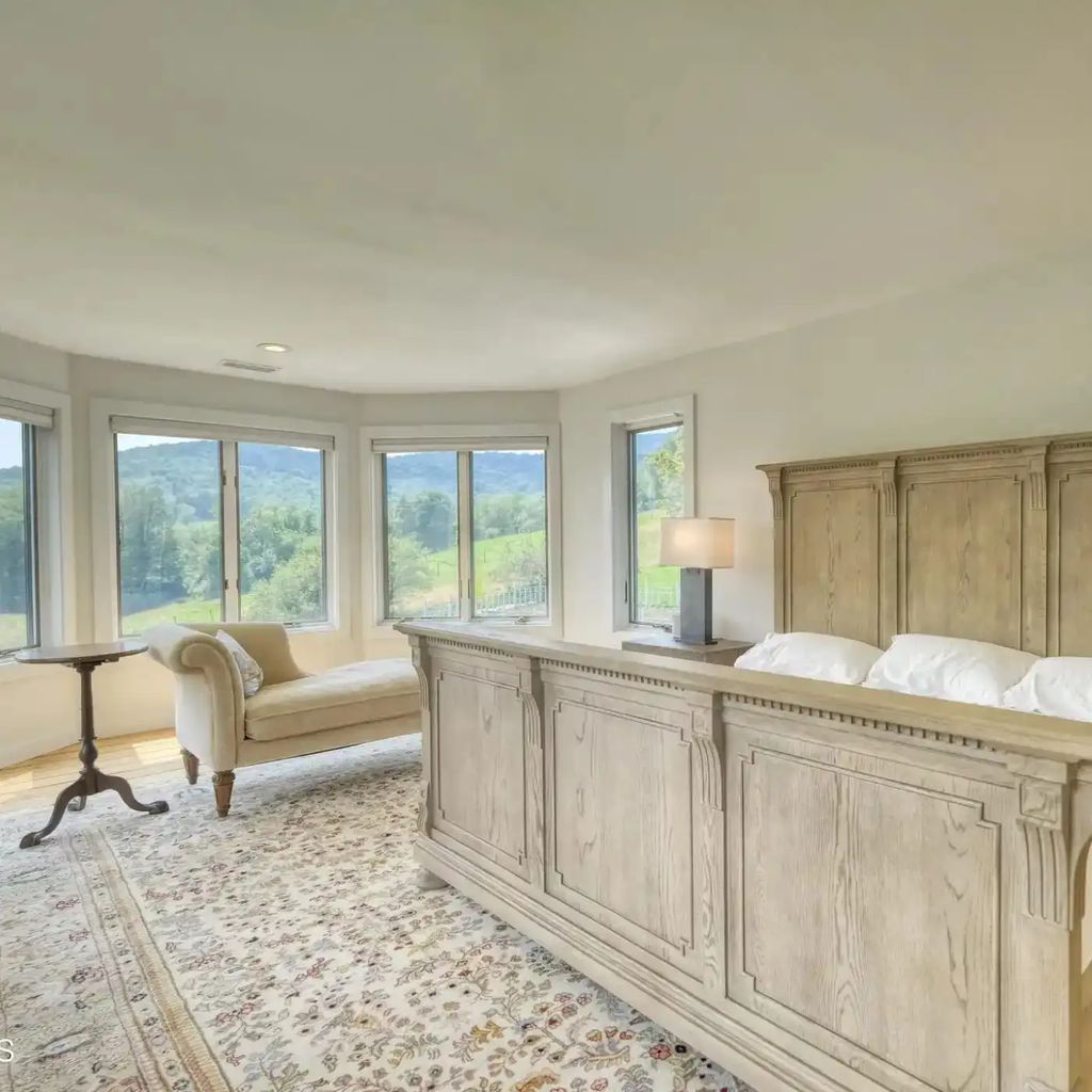 Upstairs, the primary bedroom suite is a quiet haven designed for rest and reflection. Earth-toned walls and soft wood floors create a calm atmosphere, while large windows offer panoramic views of the surrounding landscape. A vintage writing desk sits near the window, perhaps once used for personal reflection or script reading.